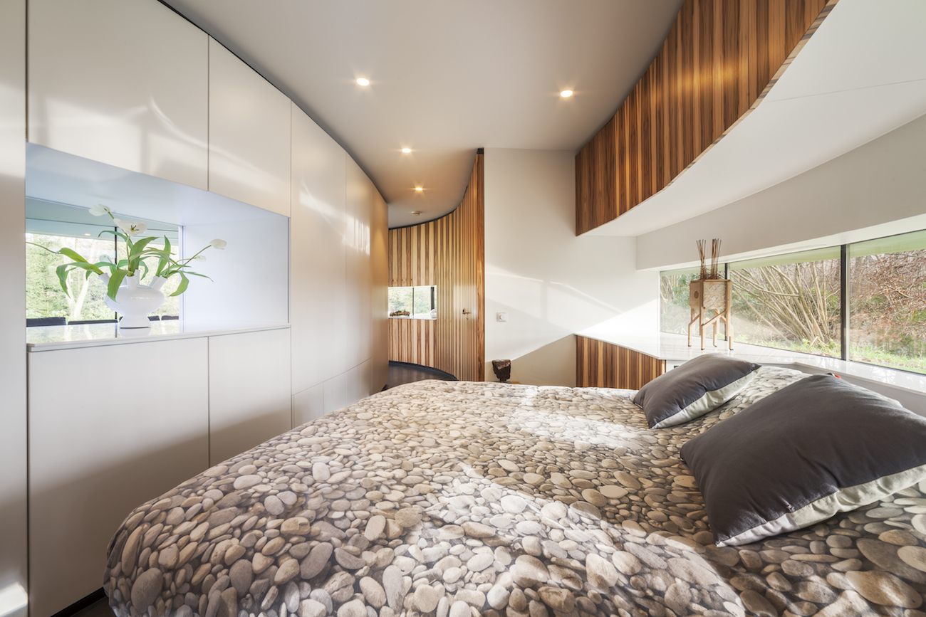 That canopy wraps around the entire home, offering shade in the summer and shelter in the rain - no matter which way the wind blows. A gentle slope in the garden rises to meet the home near the kitchen and bedroom, allowing residents to look their dogs in the eye, whether preparing dinner or saying goodnight. Mirror walls subtly extend this connection, creating reflections and sightlines that blur the boundary between architecture, nature and companionship.