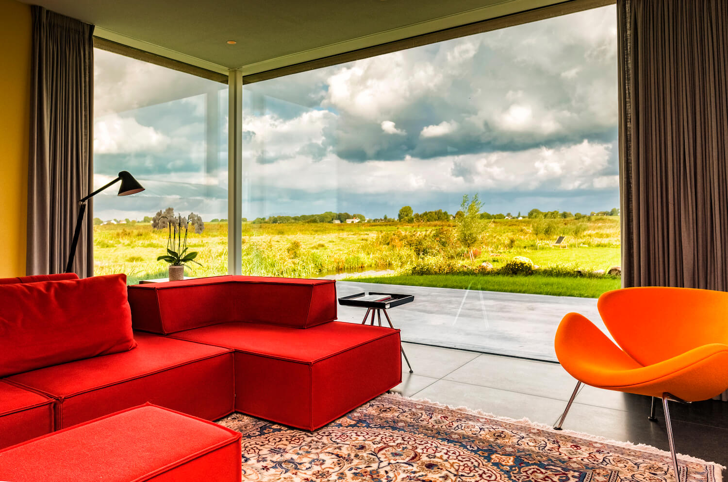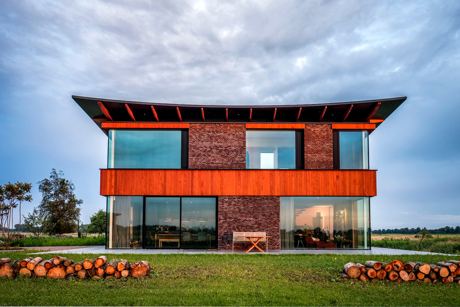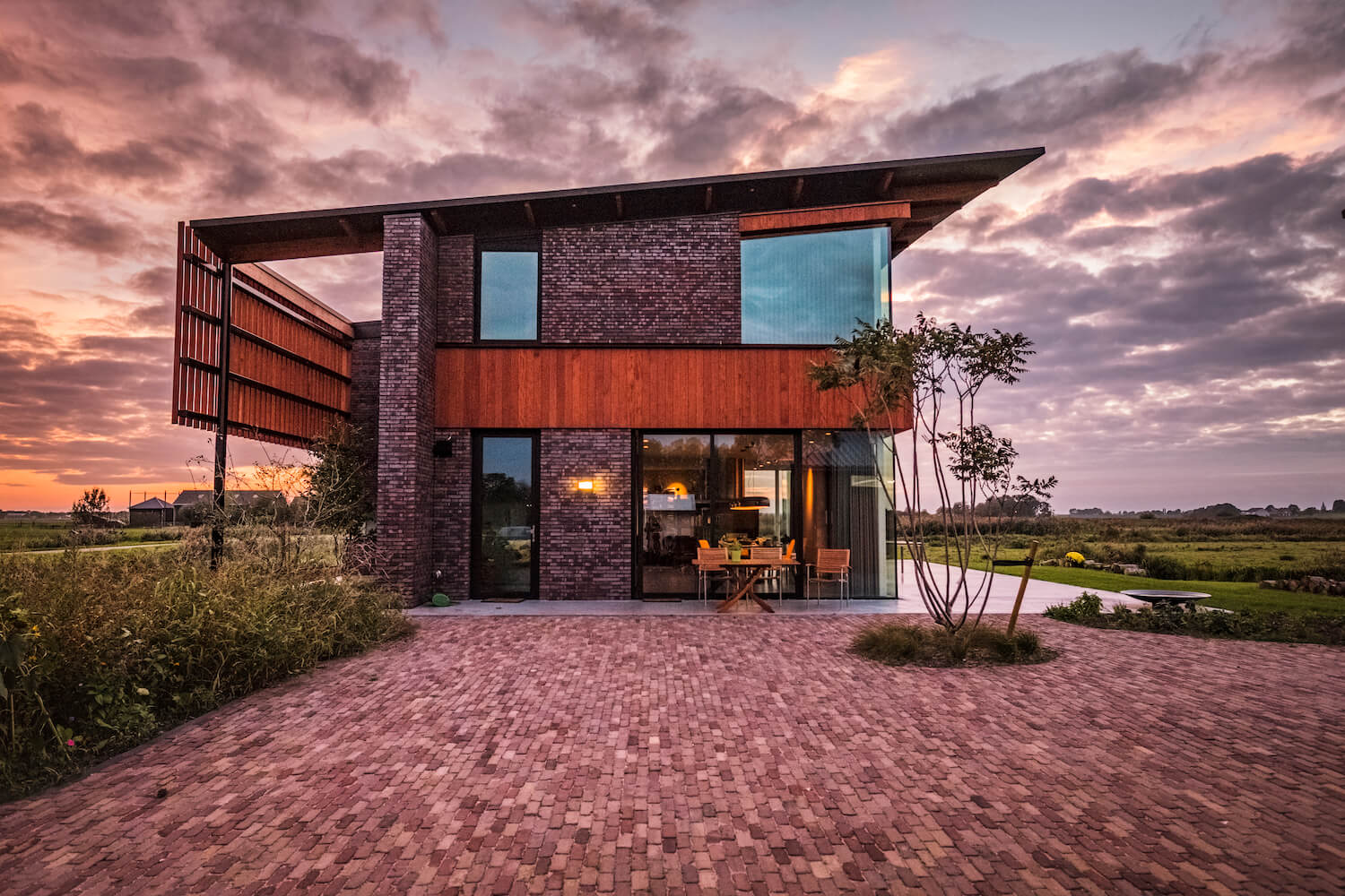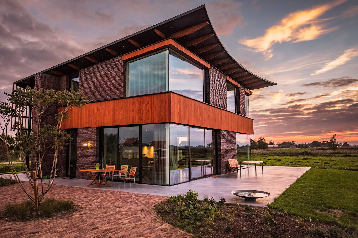 We designed 3 buildings. A villa, a boathouse and a storage building. Together the buildings provide the necessary privacy towards the street and the neighbours. How can we blend in these buildings with the overwhelming natural landscape with lakes and farm buildings? The villa design has a split personality. To blend in with the neighbouring farm buildings, the streetside of this modern villa has style elements of farms: brickwork and solid looking walls, a very present roof lining that starts quite low, at the lowest floor. To blend in with nature, the gardenside of the villa and the storage building are inspired by pavilion architecture: more lightly built. The boathouse design reflects the design of typical storage buildings of farms.