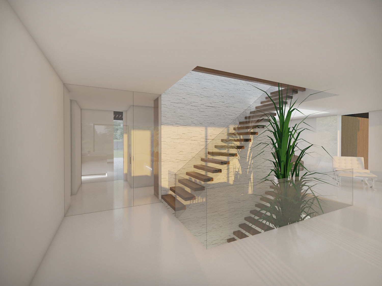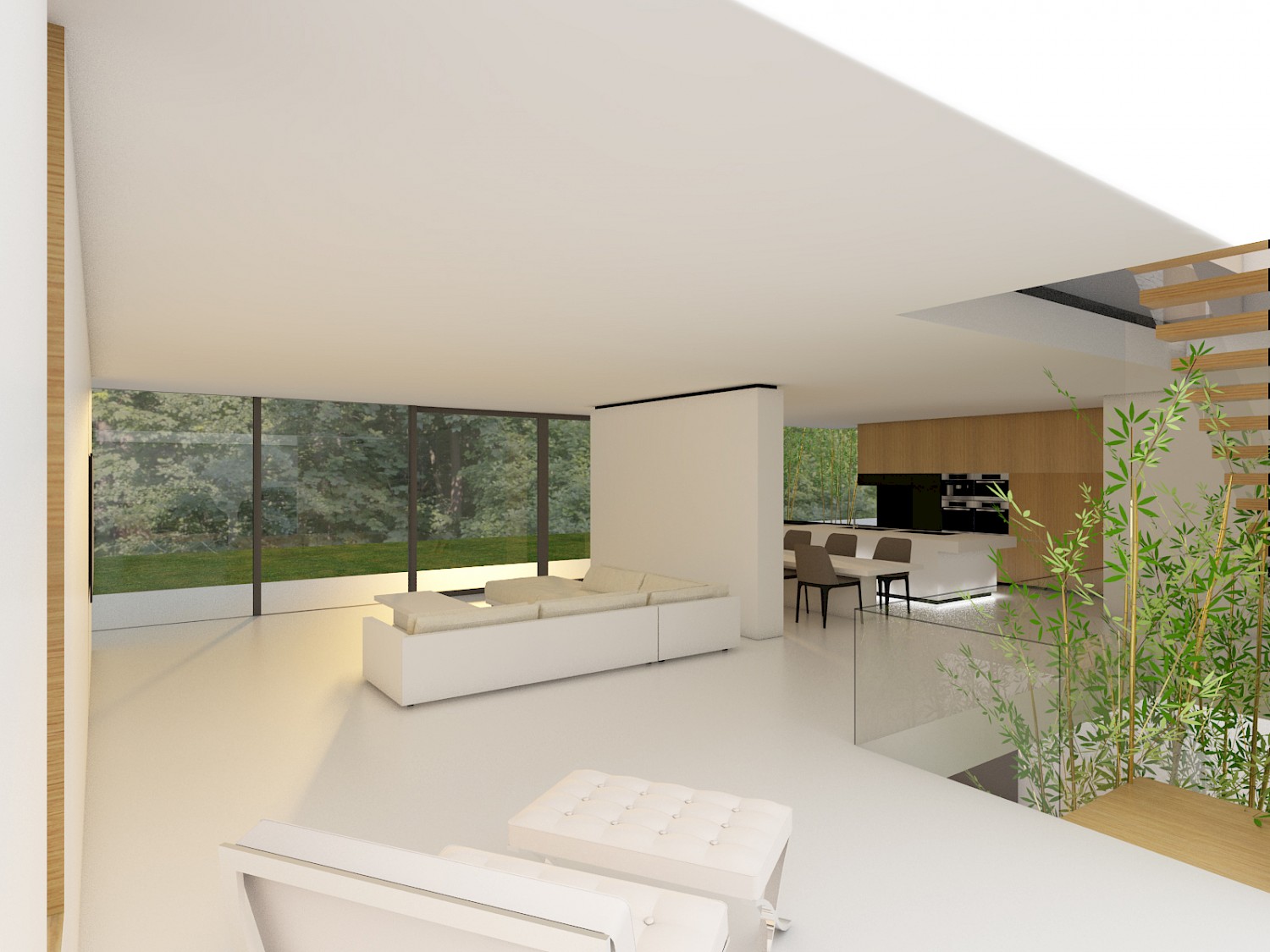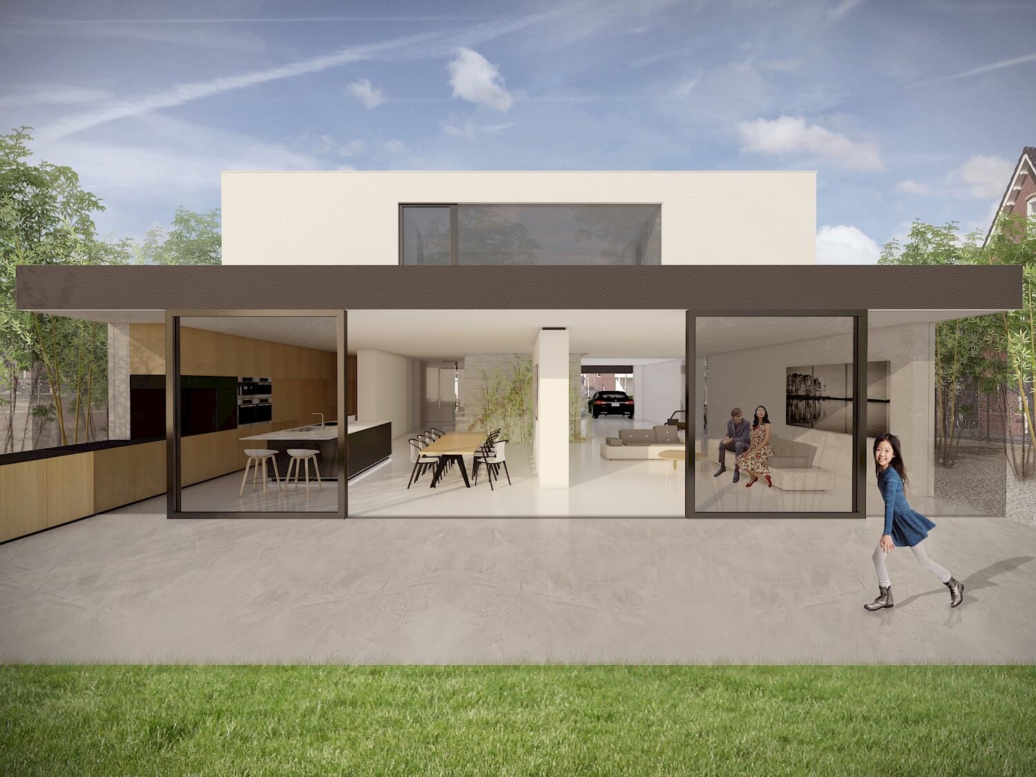 Enjoying the design of cars while being in the living room. That became a design challenge. We designed the garage as an extension of the living room: for a visual connection a glass wall with sliding doors between the two areas is used. The floor finish is the same for both areas. If the cars are out and the sliding doors open, the garage can function as a second living room for large family gatherings or childrens parties.