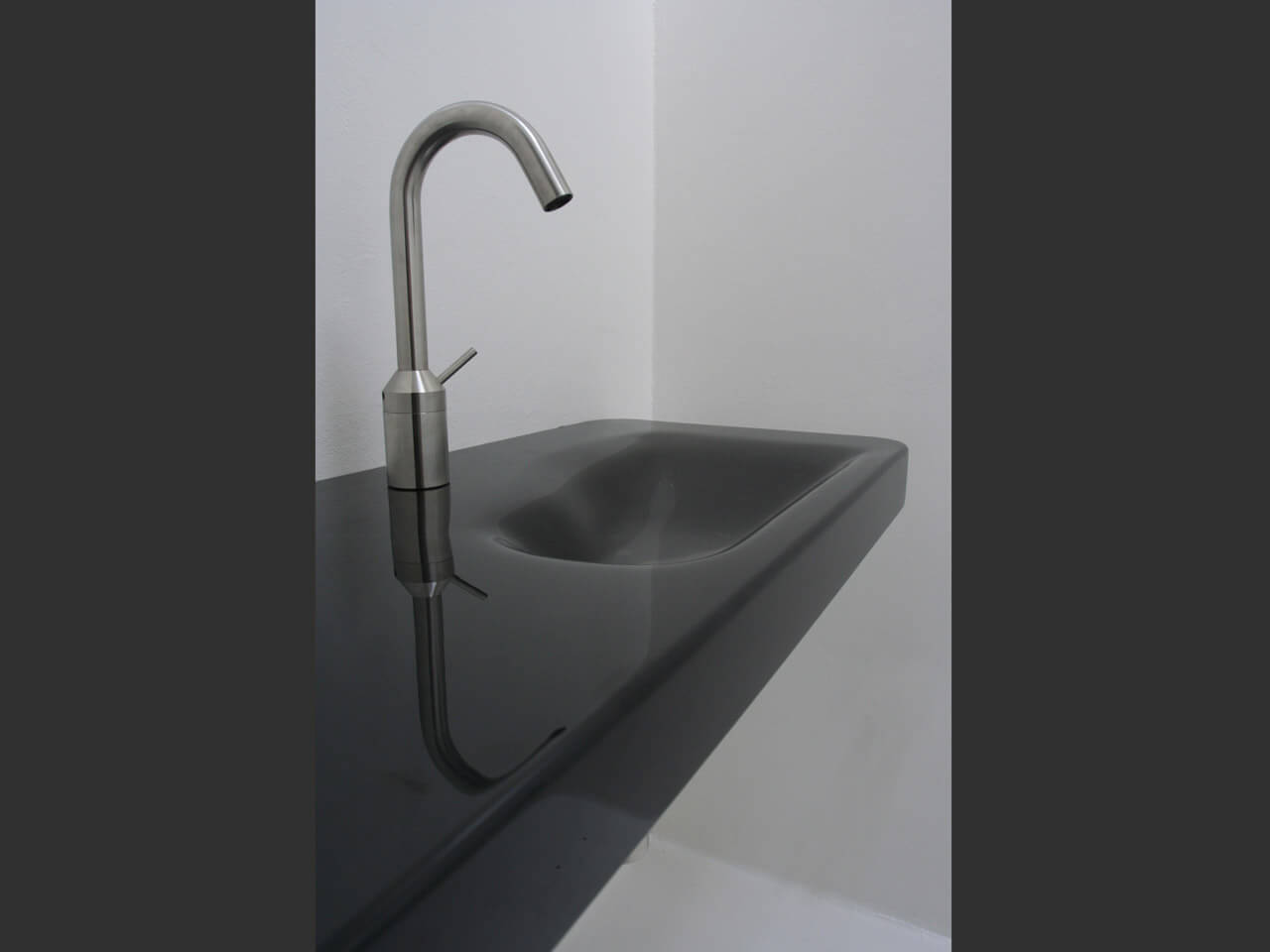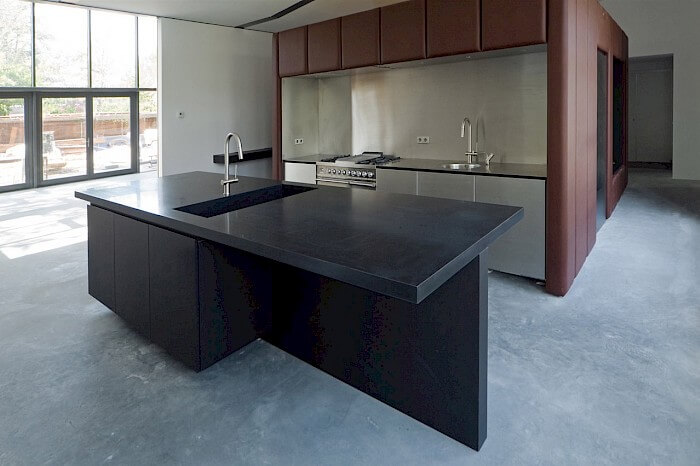 For the main interior structure. we used blank plywood panels and white stucco to match with the typical informal existing materials. To strengthen the character of the interior we added a custom designed cooking island, a leather cladded room divider and custom designed epoxy resin sinks.