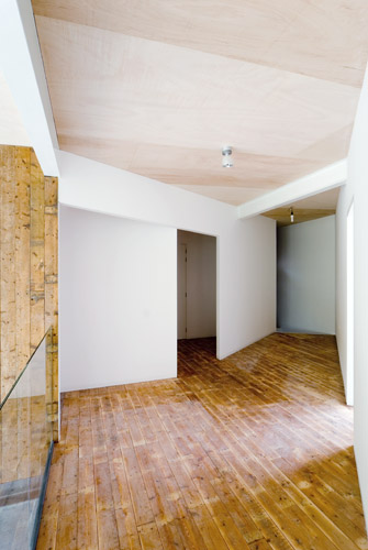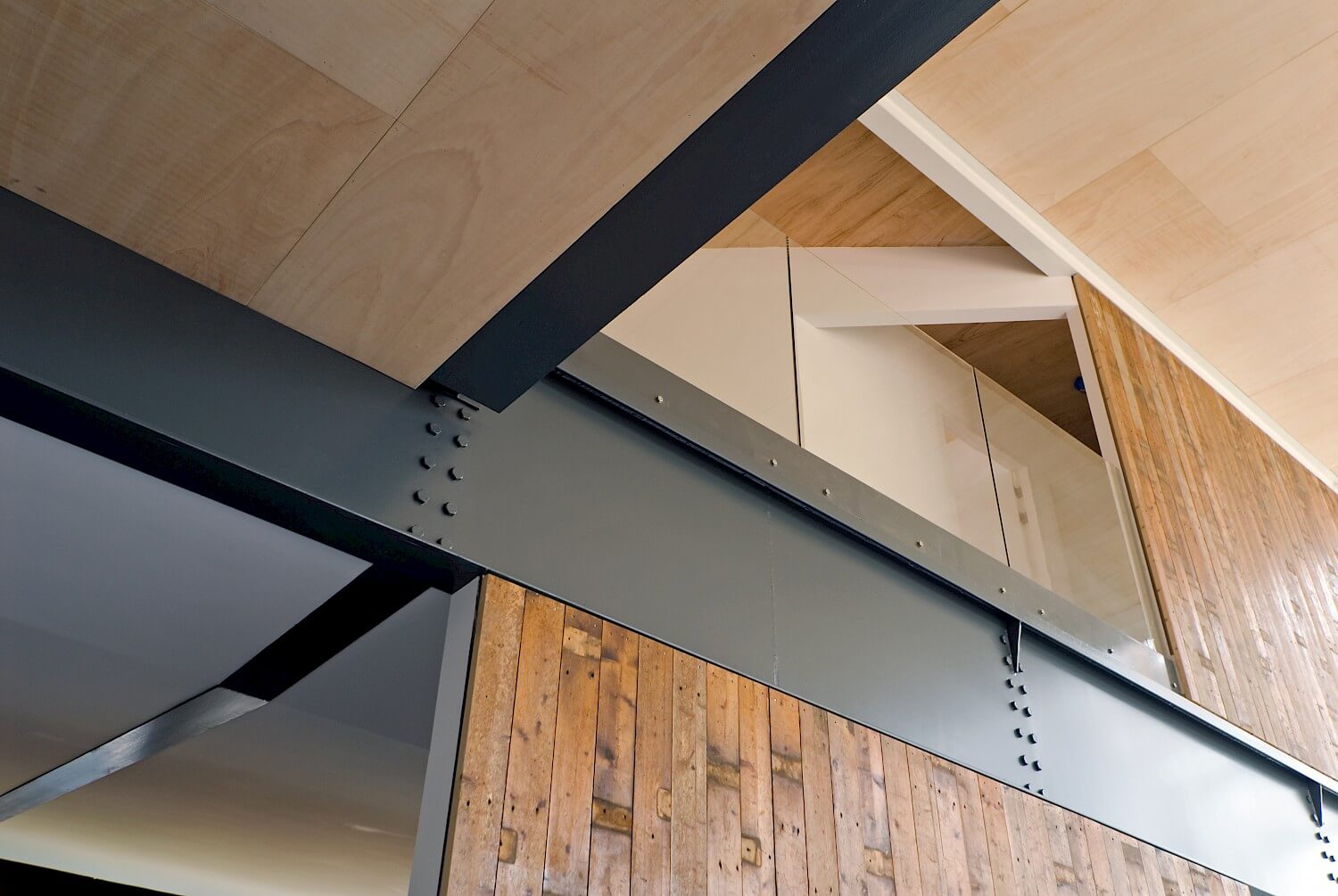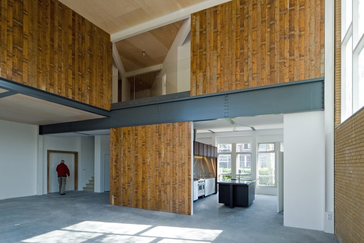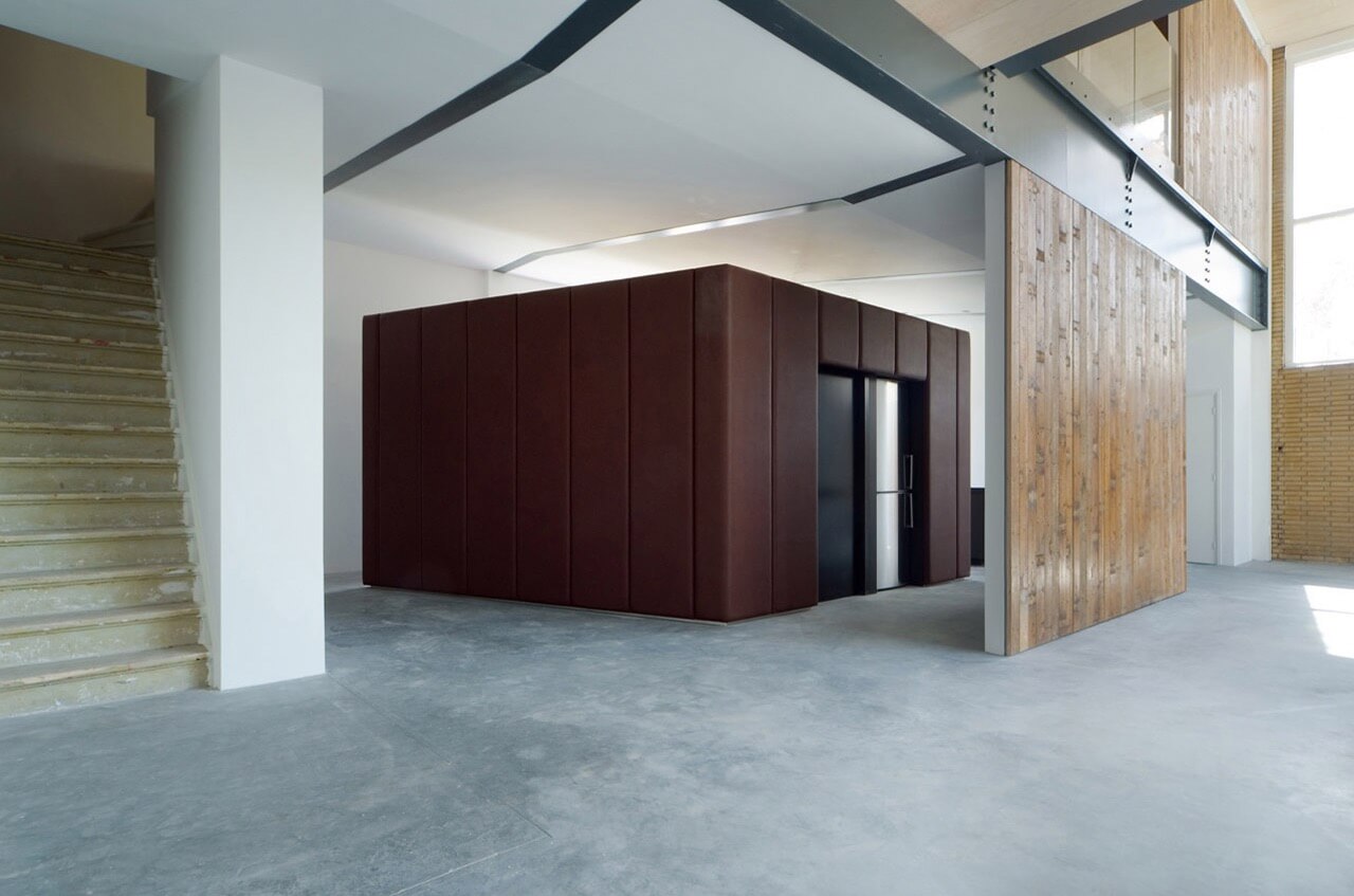 In our further search for preserving typical 'church' architecture elements in the interior, we found that the rooms were also not special: exposed metal construction brickwork, wooden window frames. Only the altar, the organ, the church benches and the oak wooden flooring appeared as authentic remains of a church. But the altar, the organ and the benches were sold by the previous owner. So the only unique element was the oak wooden flooring. We decided to reuse this floor as internal wall cladding and to expose the patina of the wooden planks.
