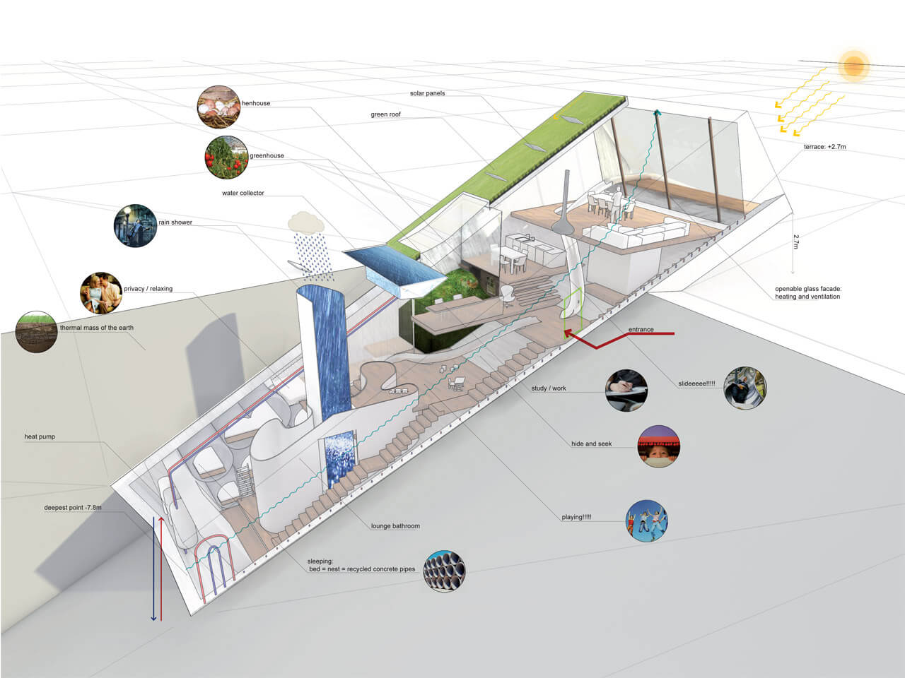 How can we make use of the earth as a natural resource? How can sustainability actually be great fun? With a home dug into the ground, you can make use of earth's temperature, so the house will not heat up too much in the summer or cool down in the winter. With an outdoor shower, you are happy when it rains, so you can make use of free rain as a natural resource. With a slide you go down fast and gravity becomes your friend. These are just a few ideas dealing with sustainability in a fun way.