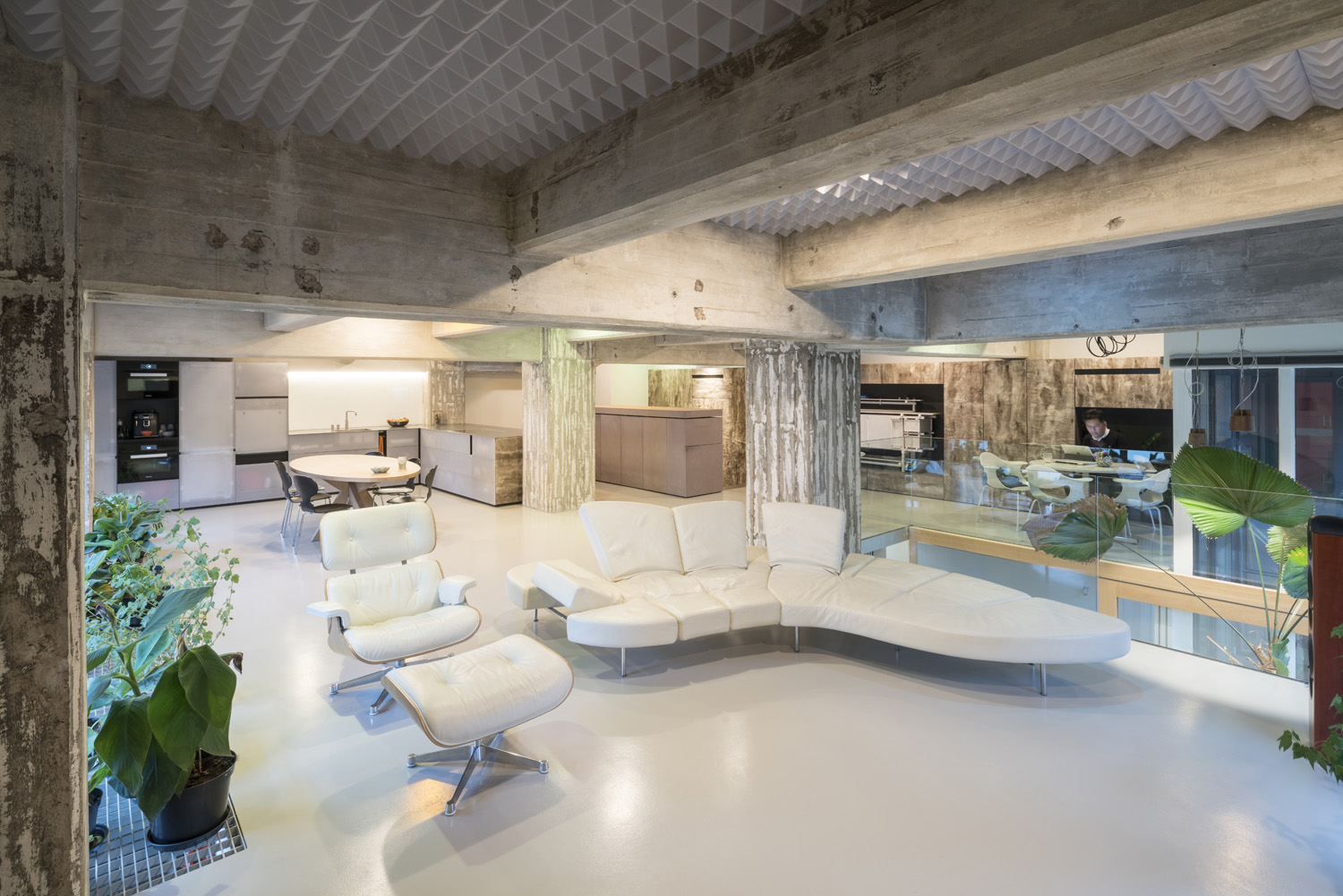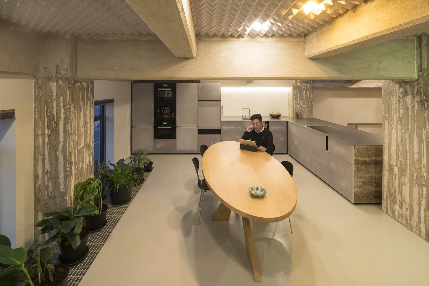 The felt, as well as lightweight acoustic foam panels with a pyramid textured surface, placed between the concrete beam structure of the ceiling, produce quiet acoustics in the industrial loft. These pyramids create a playful rhythm of its own and here and there you will discover hidden gems: a few differently coloured pyramids are actually ceiling lights made of epoxy by designer Vincent de Rijk together with Leo Krol of Solid Lighting.
