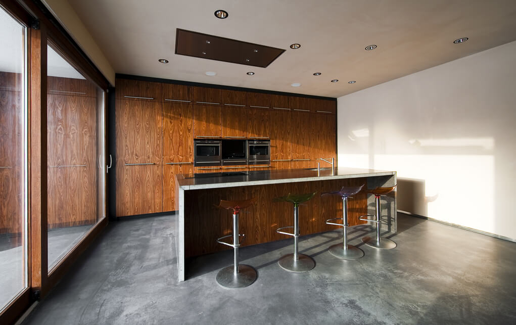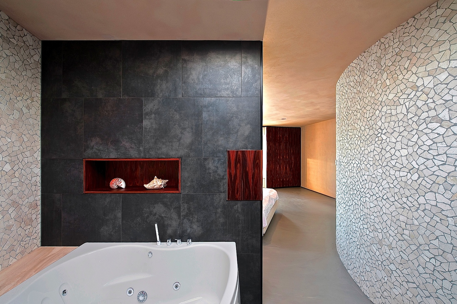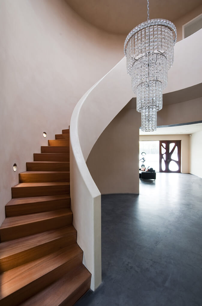 The views through to rooms beyond are marvelously effective, enabling the family to stay in contact with each other. You can see the children watching television from the office. The use of organic shapes and sustainable materials lends the villa an informal, relaxing atmosphere, even though the house can also be a perfect backdrop for elegant receptions.