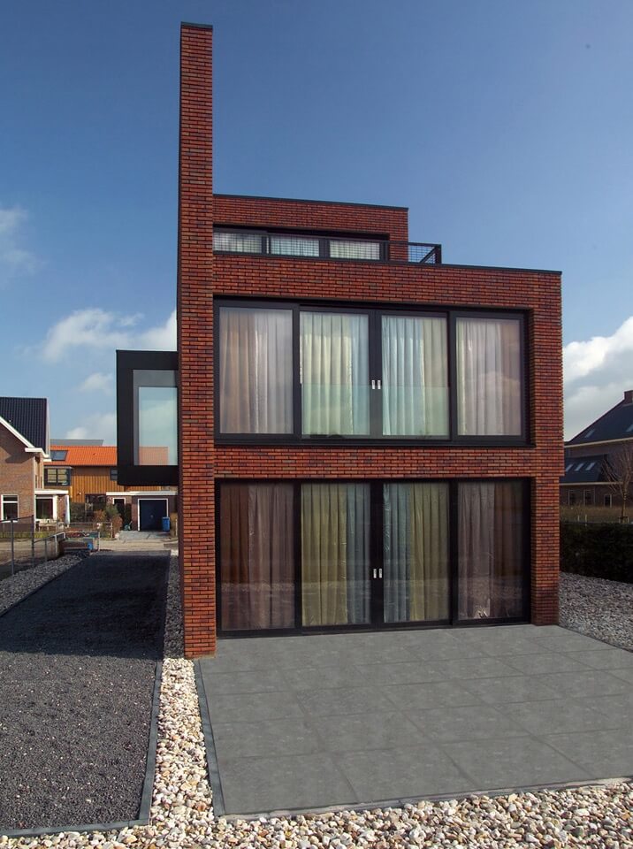 De locatie van deze woning is heel bijzonder: aan de ene kant staan er kleinschalige vrijstaande semi-klassieke woningen met schuine kap, aan de andere kant is een groot appartementencomplex gepland. De opdrachtgever wilde het maximum aan privacy in zijn woning. Het huis representeert de transitie tussen deze 2 werelden: de gevel aan de kant van het geplande appartementencomplex is gesloten, op een uitstekend trappenhuis na die een intrigerend uitzicht biedt langs de gevel - de andere kant van het gebouw bestaat uit een informele compositie van rechthoekige volumes met veel raampartijen.
