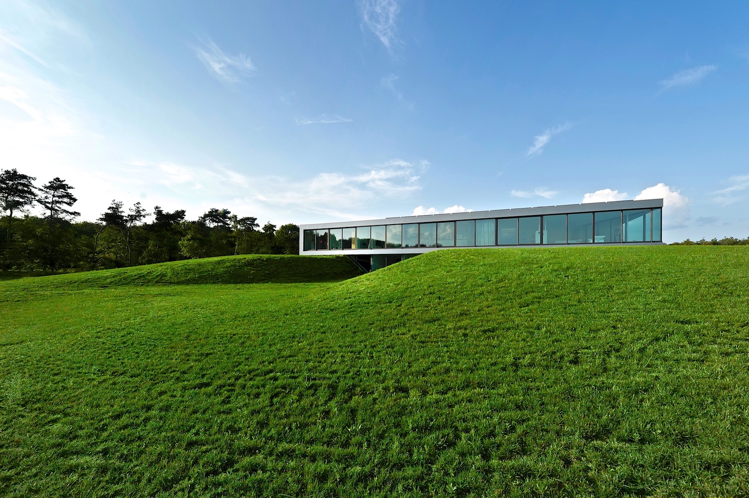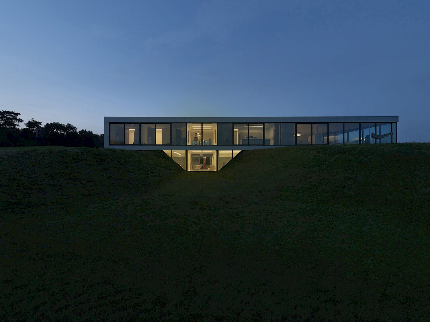 De weidse ruimte vóór het decor van het huis biedt een stijlvol kader voor het park, grotendeels voor wandelaars toegankelijk. Het park sluit aan bij het landschap van de omgeving. De betrokken landschapsarchitect zorgde voor een herinrichting van het terrein, terug naar hoe het ooit was: coulisselandschap. Om de grond te verarmen werd de bovenlaag van het hele terrein afgegraven. Vanuit duurzaamheid geredeneerd is de grond hergebruikt. Het resultaat hiervan? Een terpwoning. Het woongedeelte ligt op de heuvel, de kelder er middenin.