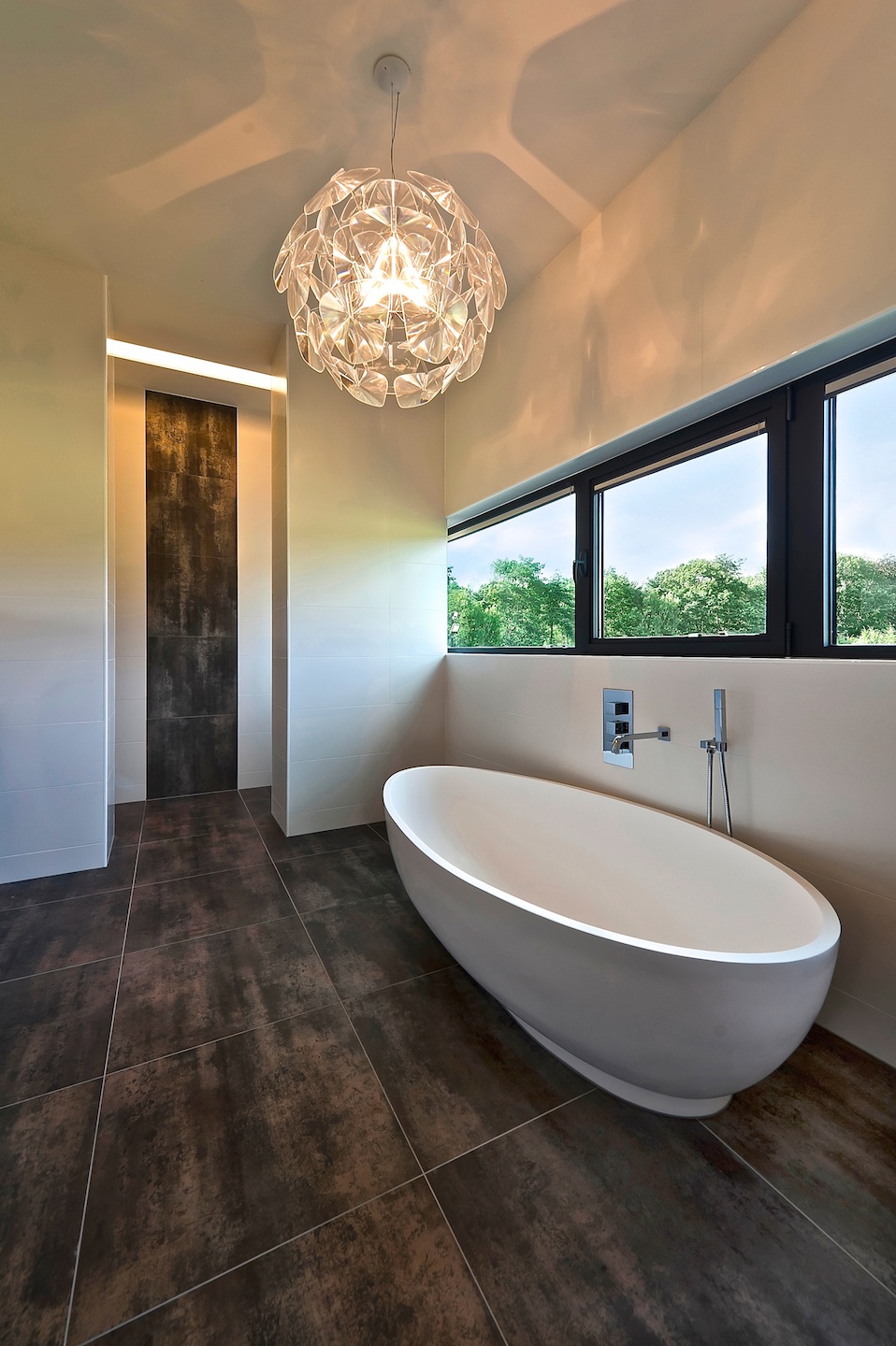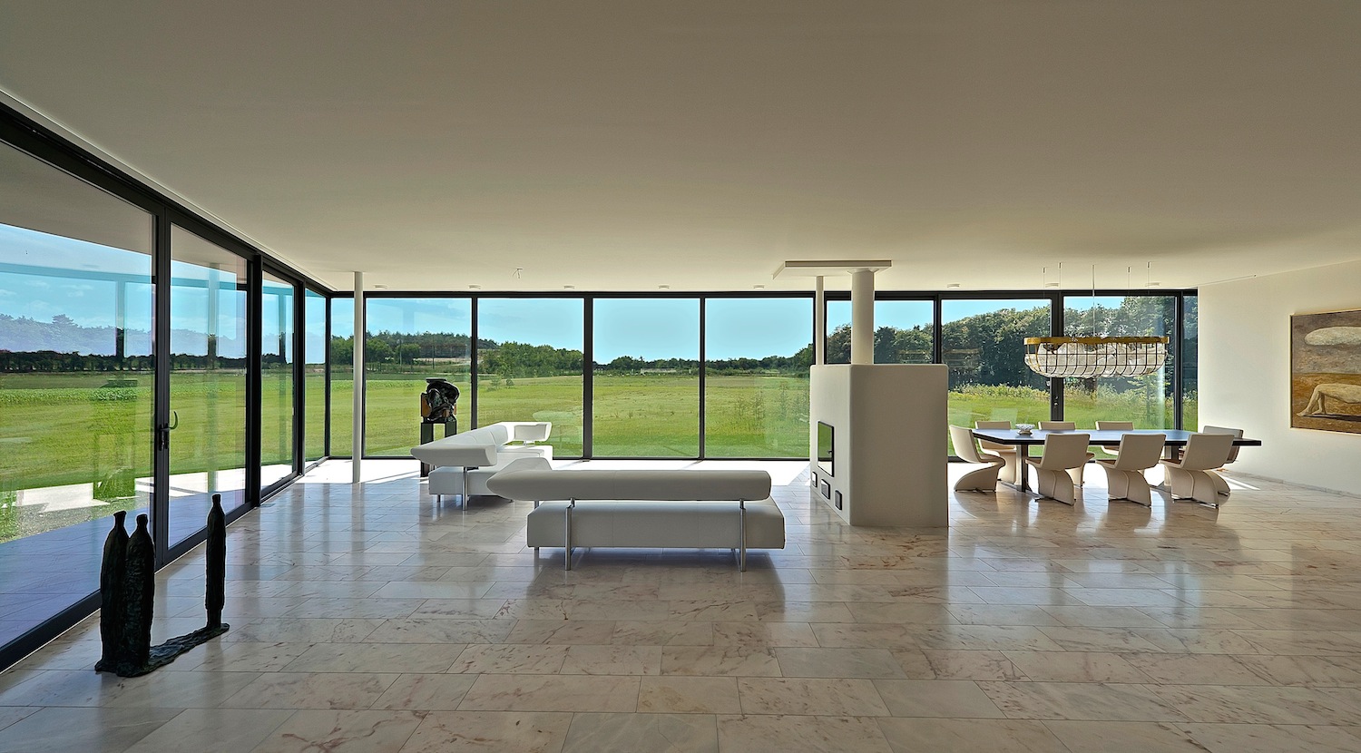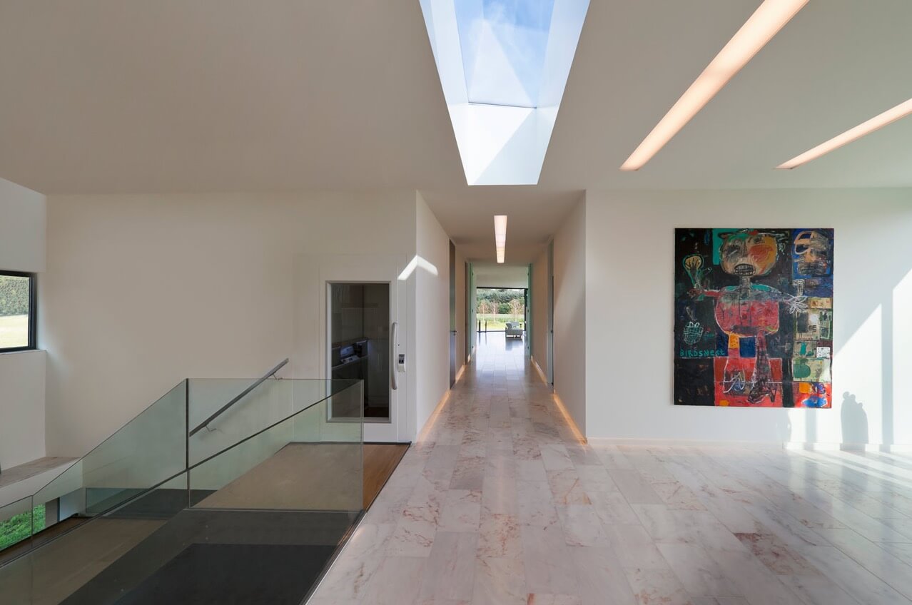 De familie wilde graag ruimte voor hun bijzondere kunst verzameling. Wij bedachten een 30 meter lange gang als verbinding tussen de kamers, die tegelijk ook dienst doet als kunt galerie. Met een open ruimte bij de trap en lift is rekening gehouden met de mogelijkheid om daar schilderijen of beeldhouwwerken ten toon te stellen. Verder levert het ook een panoramisch uitzicht op het landschap.