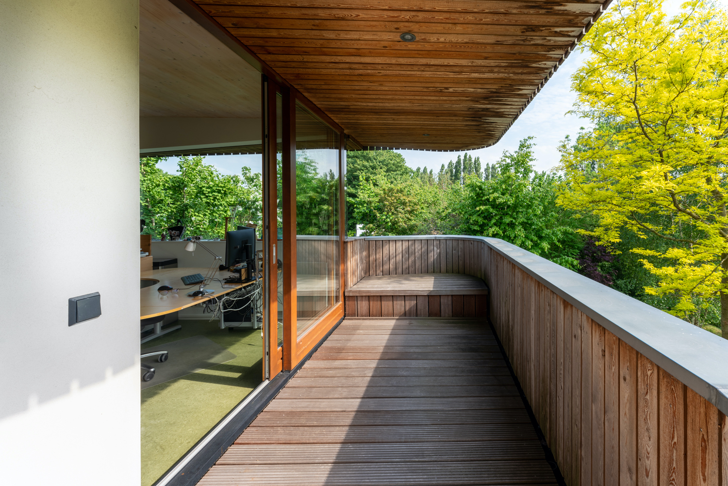 Het gebouw gaat op in de groene omgeving en is omringd door bomen. Aan de tuinzijde opent de woning zich en is er een natuurlijke relatie met het buitenleven door middel van te openen glazen pui naar de tuin en een pad naar het extra terras aan het water verderop.