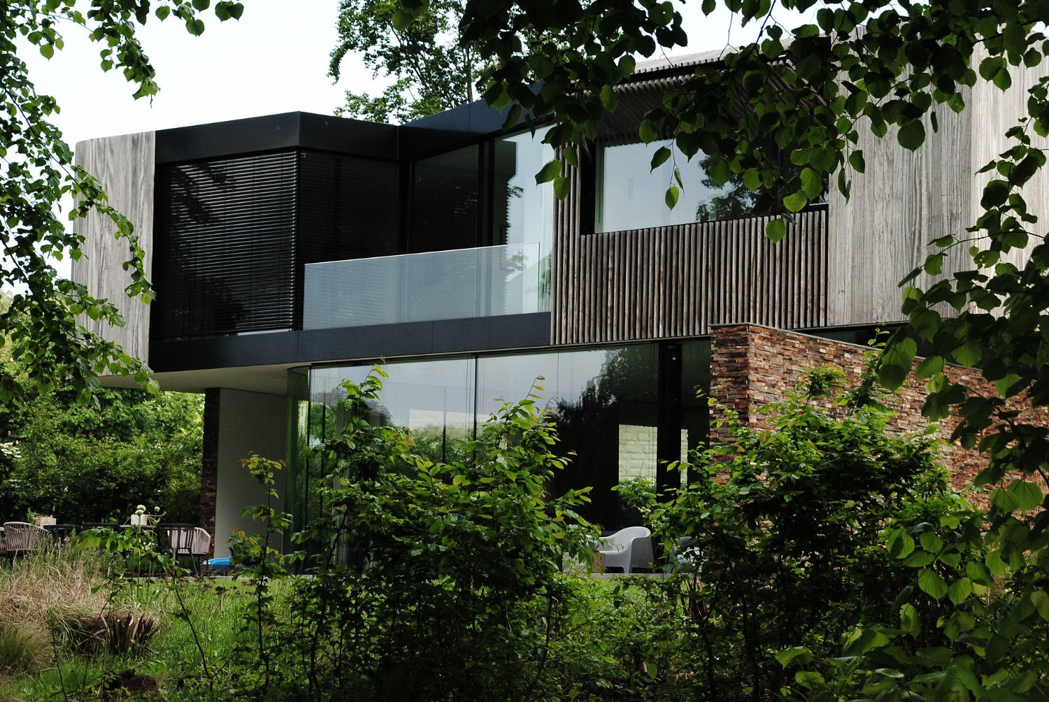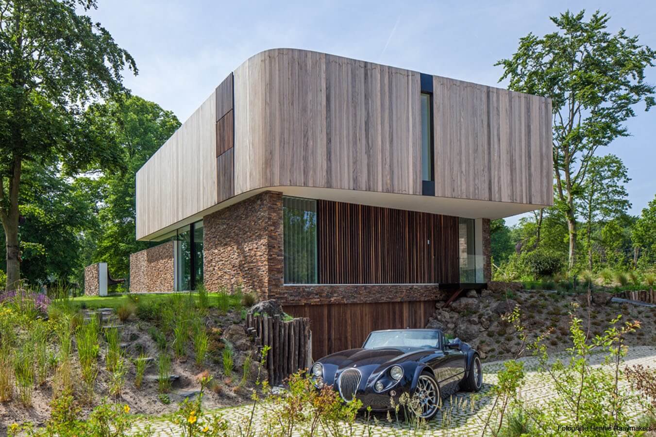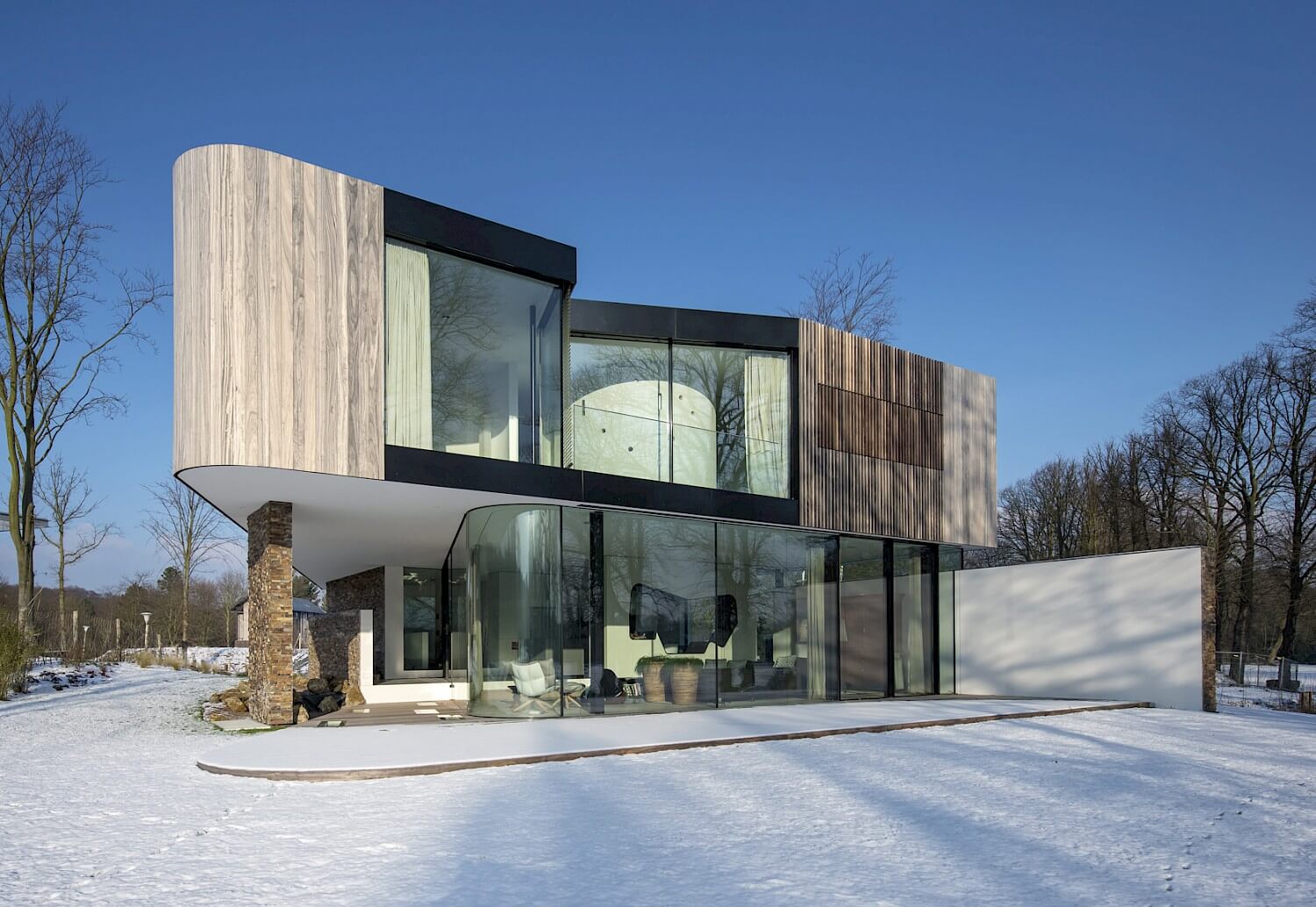 De buitenkant van deze moderne villa is uitgevoerd in natuurlijke materialen zoals steen en houten panelen, om de sfeer van het landschap te weerspiegelen. De gevel van de bovenverdieping is bekleed met houten delen, die doorgezet zijn ter plaatse van de ramen, als een soort jaloezieën, zodat deze voor de gewenste privacy zorgen. Voor maximale verbondenheid met de tuin, is de woonkamer uitgevoerd met veel glas. Verscheidene, met steen bekleedde vrijstaande elementen zorgen in de woonkamer voor beschutting en privacy. Deze zijn zo geplaatst dat er altijd momenten blijven voor ochtend-, middag- en avondzon in de woning.