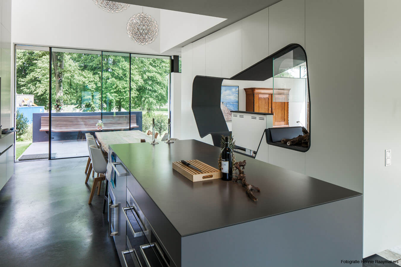 - een luie stoel met openhaard en televisie, geplaatst in een speelse uitsparing in een kastenwand die fungeert als scheiding tussen de keuken en de woonkamer