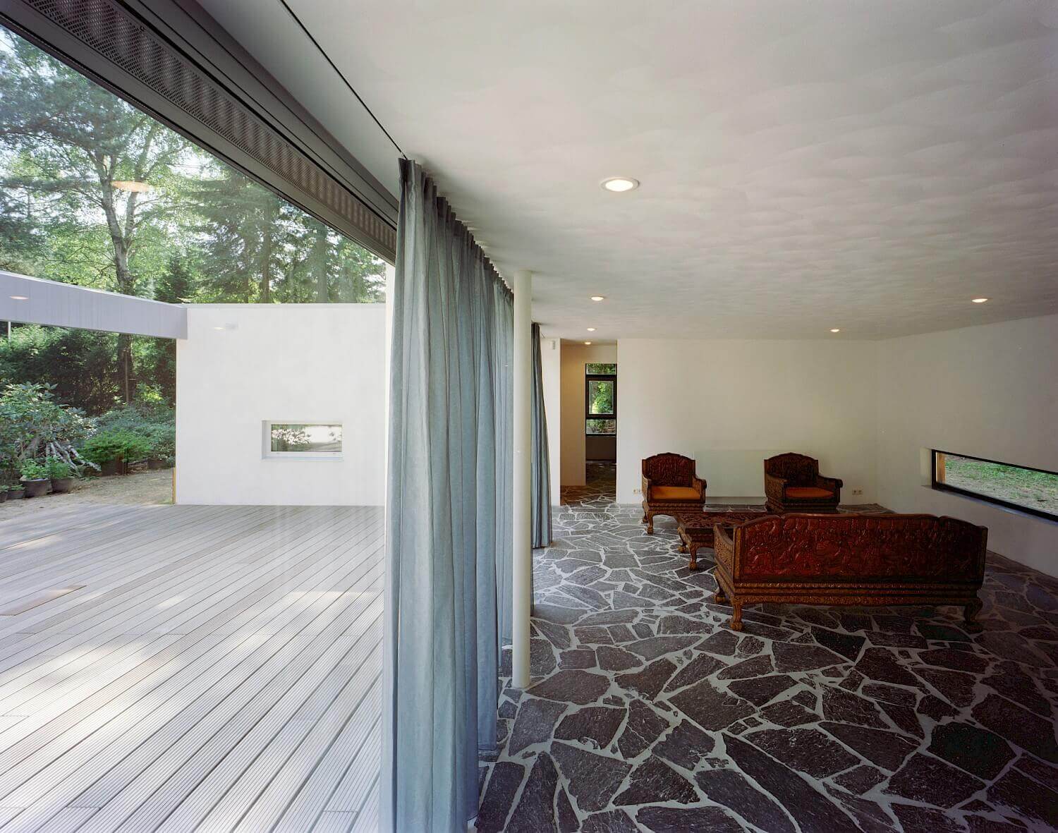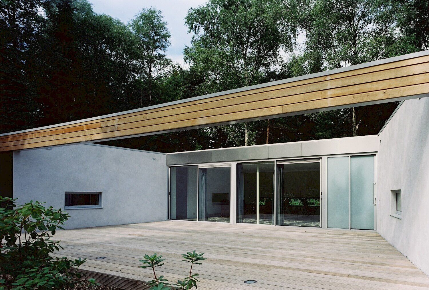 Deze sensaties uit Indonesië zijn meegenomen in het ontwerp voor de bungalow in het Nederlandse bos. Een houten terras voor het huis is ontworpen als een buiten woonkamer, goed voor toevallige ontmoetingen met buurtbewoners en een kopje koffie. Dit terras deed de familie denken aan hun veranda in Indonesië.