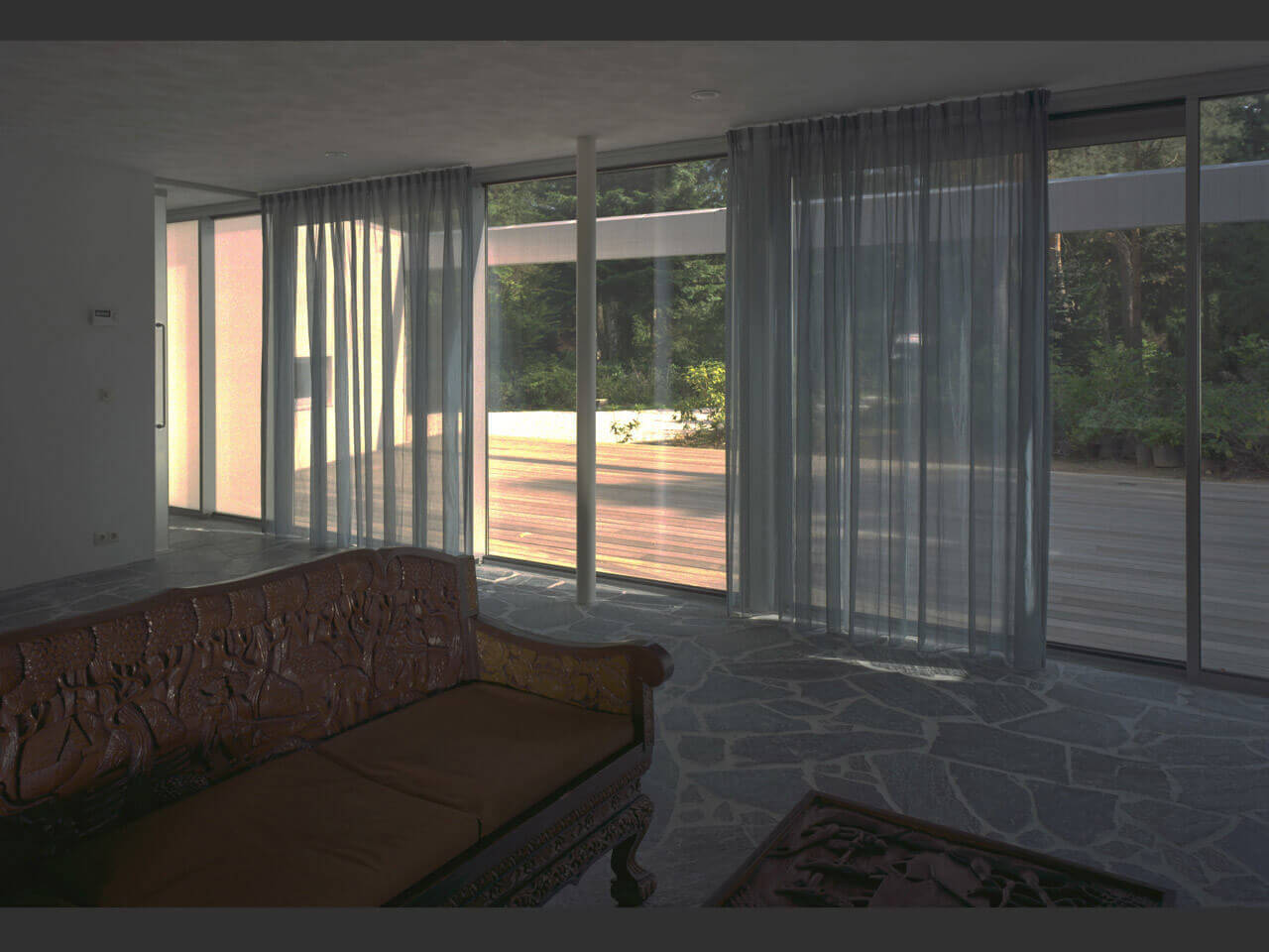 Alle vloeren in de kamers zijn bekleed met natuursteen en vloerverwarming. Op blote voeten lopen in de woonkamer doet denken aan het leven in Indonesië. Op blote voeten lopen terwijl er buiten sneeuw ligt aan de andere kant van de glazen gevel is een nieuwe, spannende gewaarwording waar ze blij van worden.