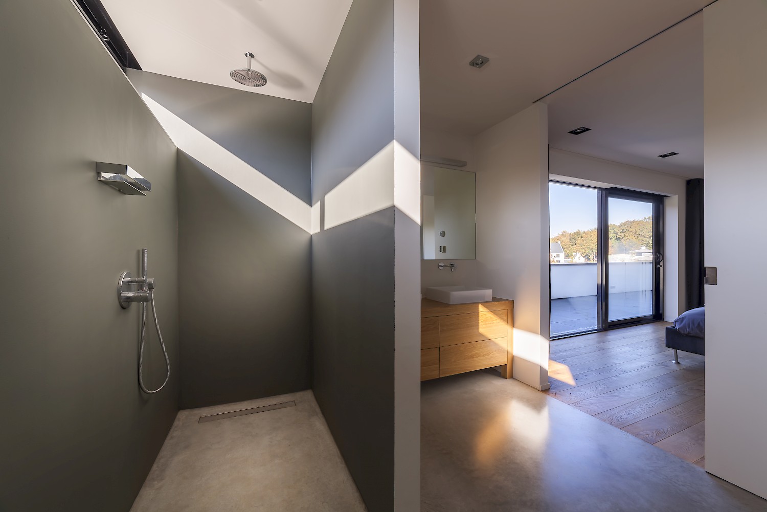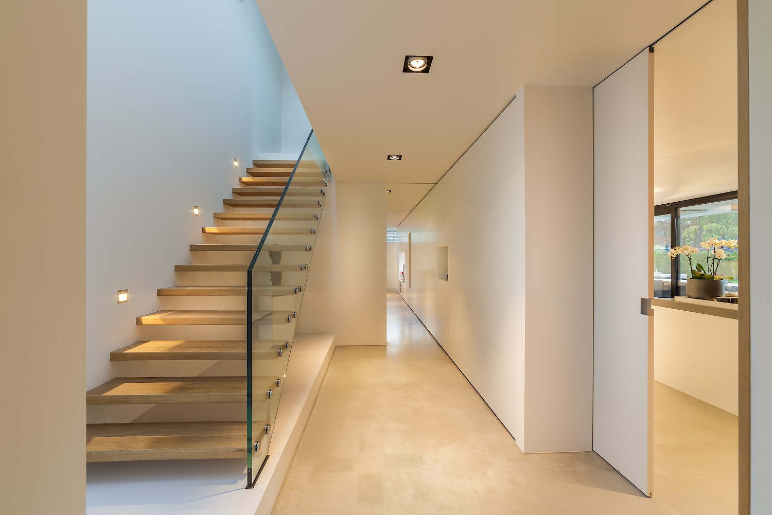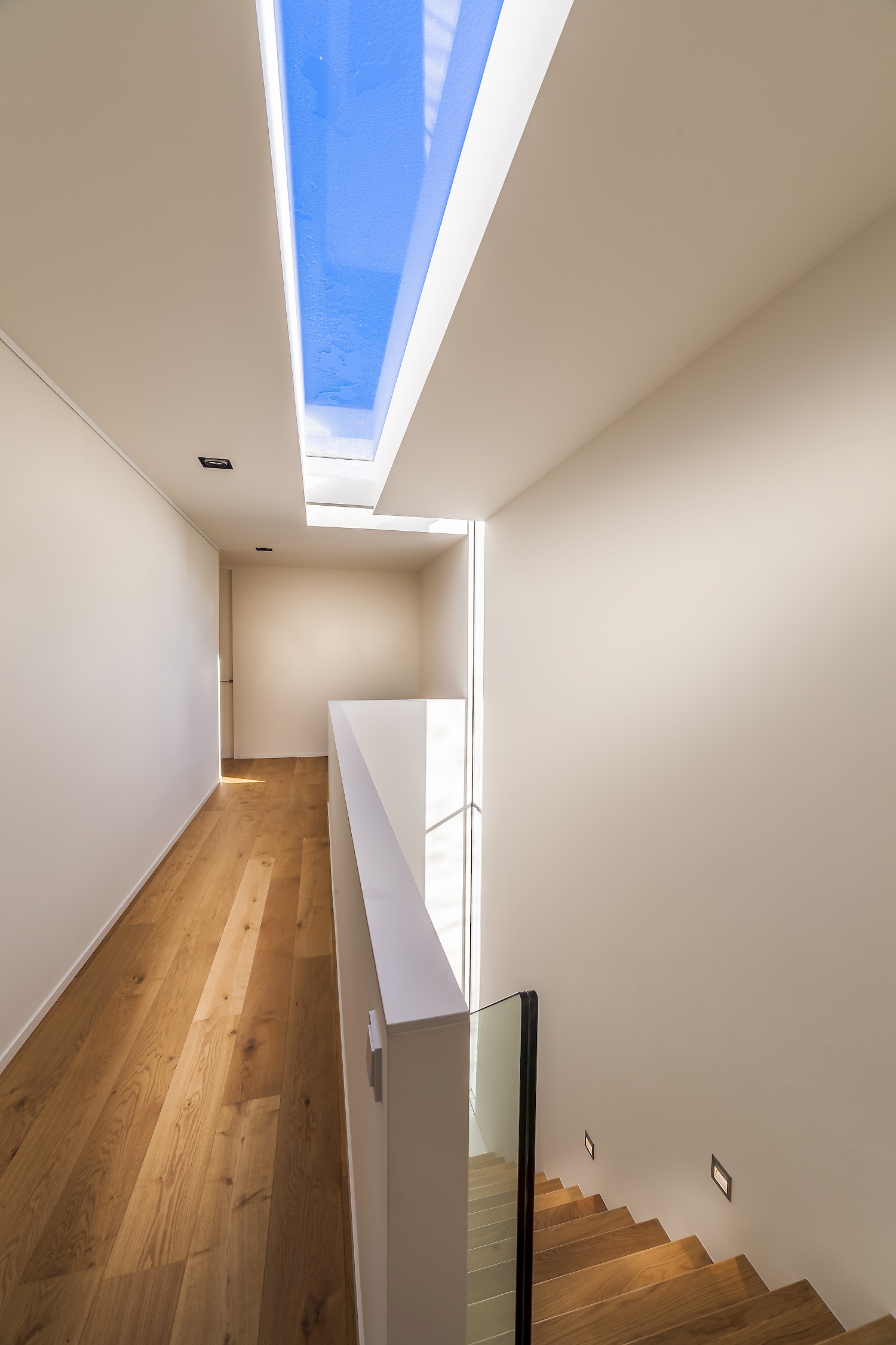 Een 10 meter lang raam begint in de gevel aan de straatzijde en loopt helemaal door tot in het dak. Het levert een effect op van doorlopend uitzicht, licht en privacy als je de trap op of af loopt. Dus de ochtendwandelingetjes van slaapkamer naar de woonkamer hebben een licht karakter en een panoramische beleving in deze villa.