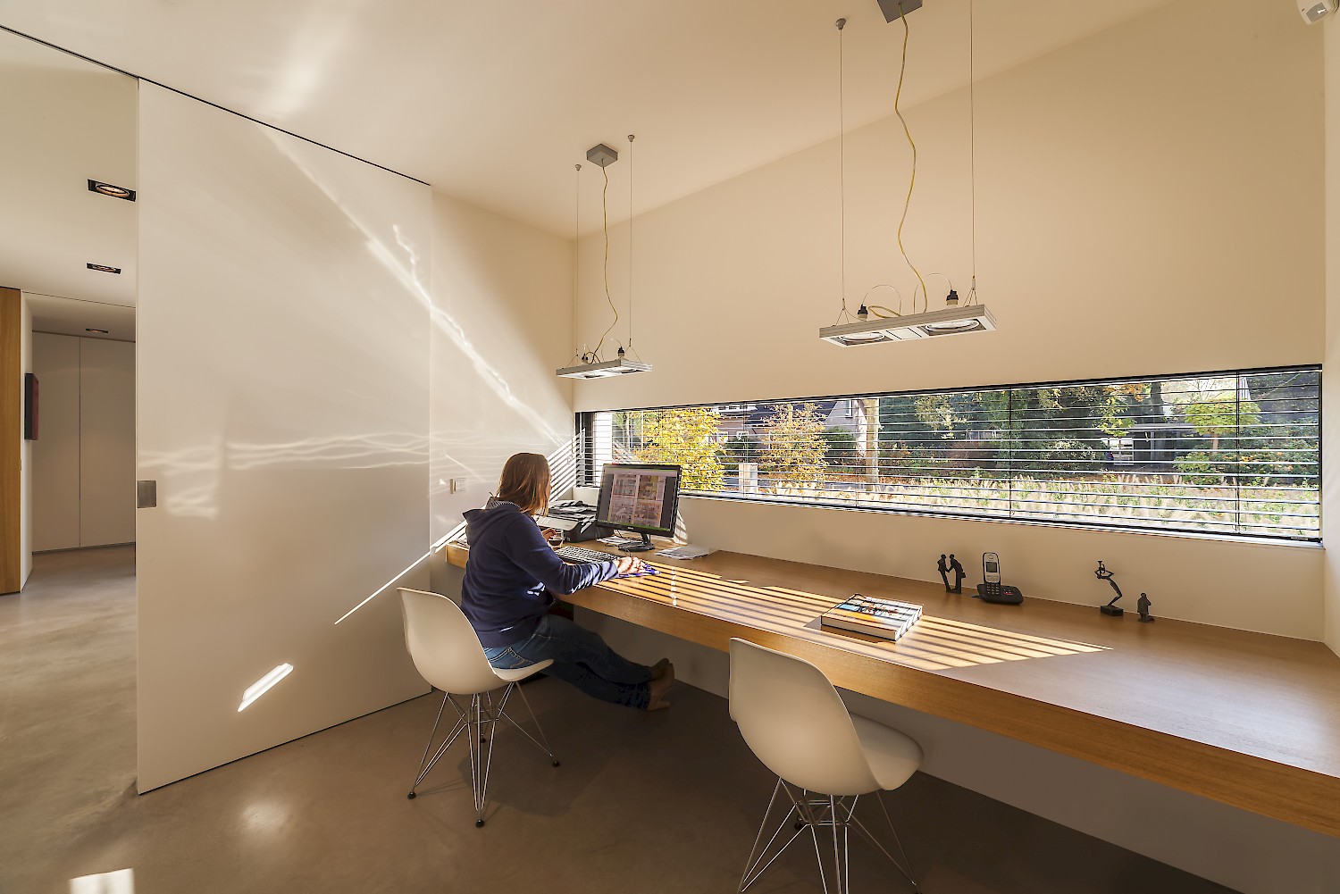 De wens van het gezin was om privacy te hebben en tegelijkertijd een panoramisch uitzicht. Twee extreem lange en 50 centimeter smalle ramen zijn zo toegepast in deze moderne villa dat ze lijken op precieze sneden van een chirurg. Een 8 meter lang raam laat licht binnen in de werkkamer en geeft een panoramisch uitzicht op de straat vanaf de werktafel.
