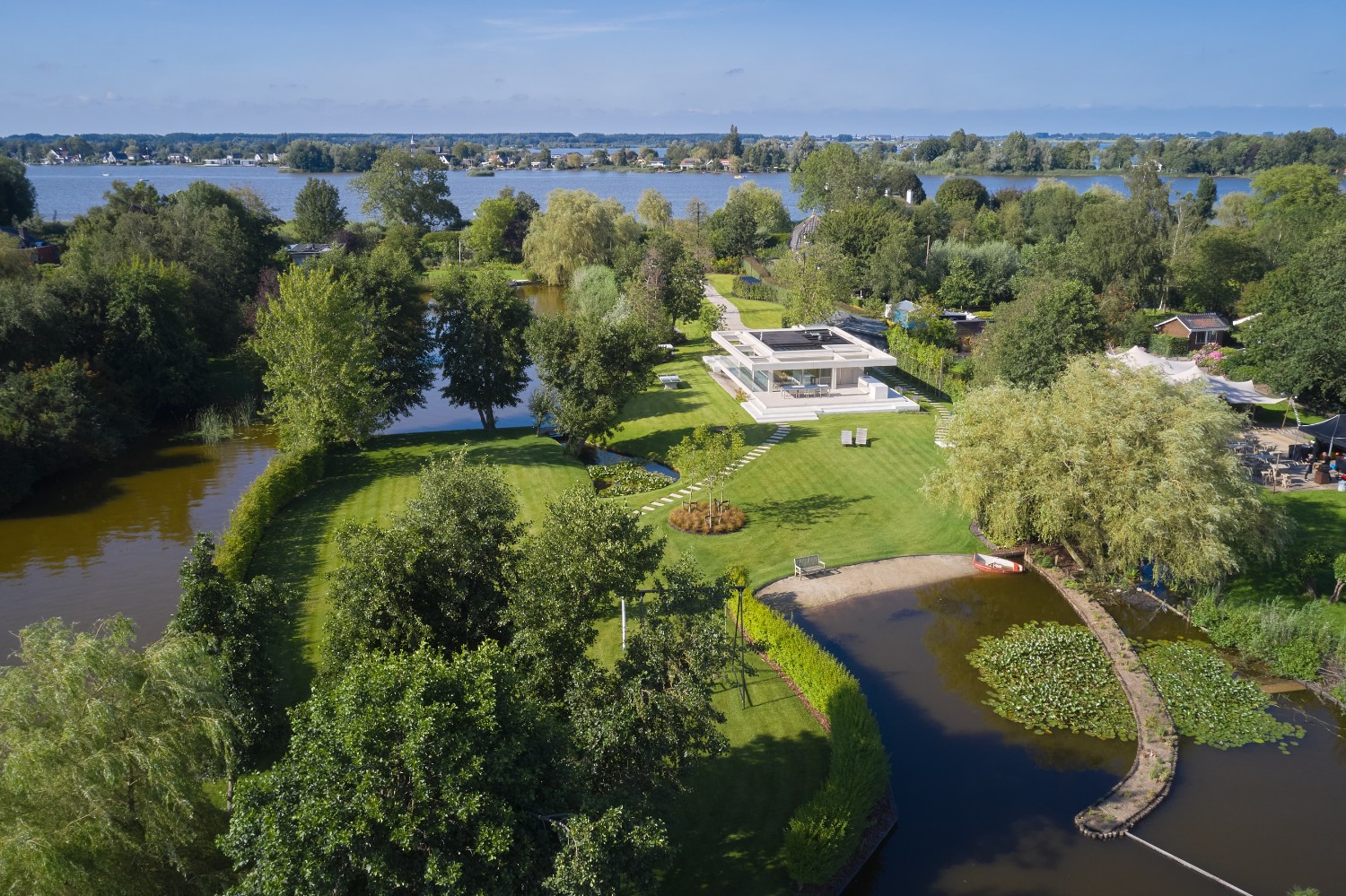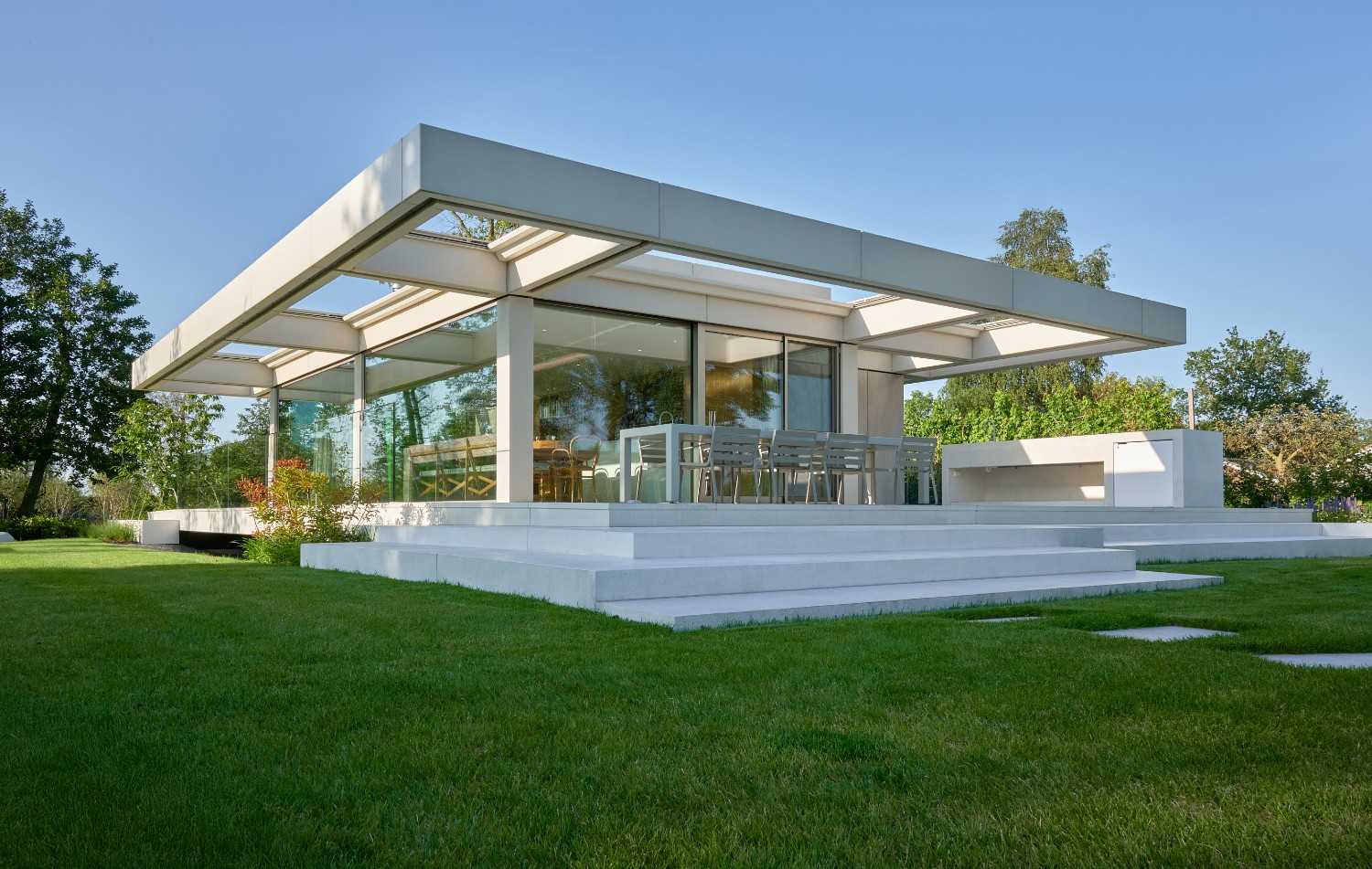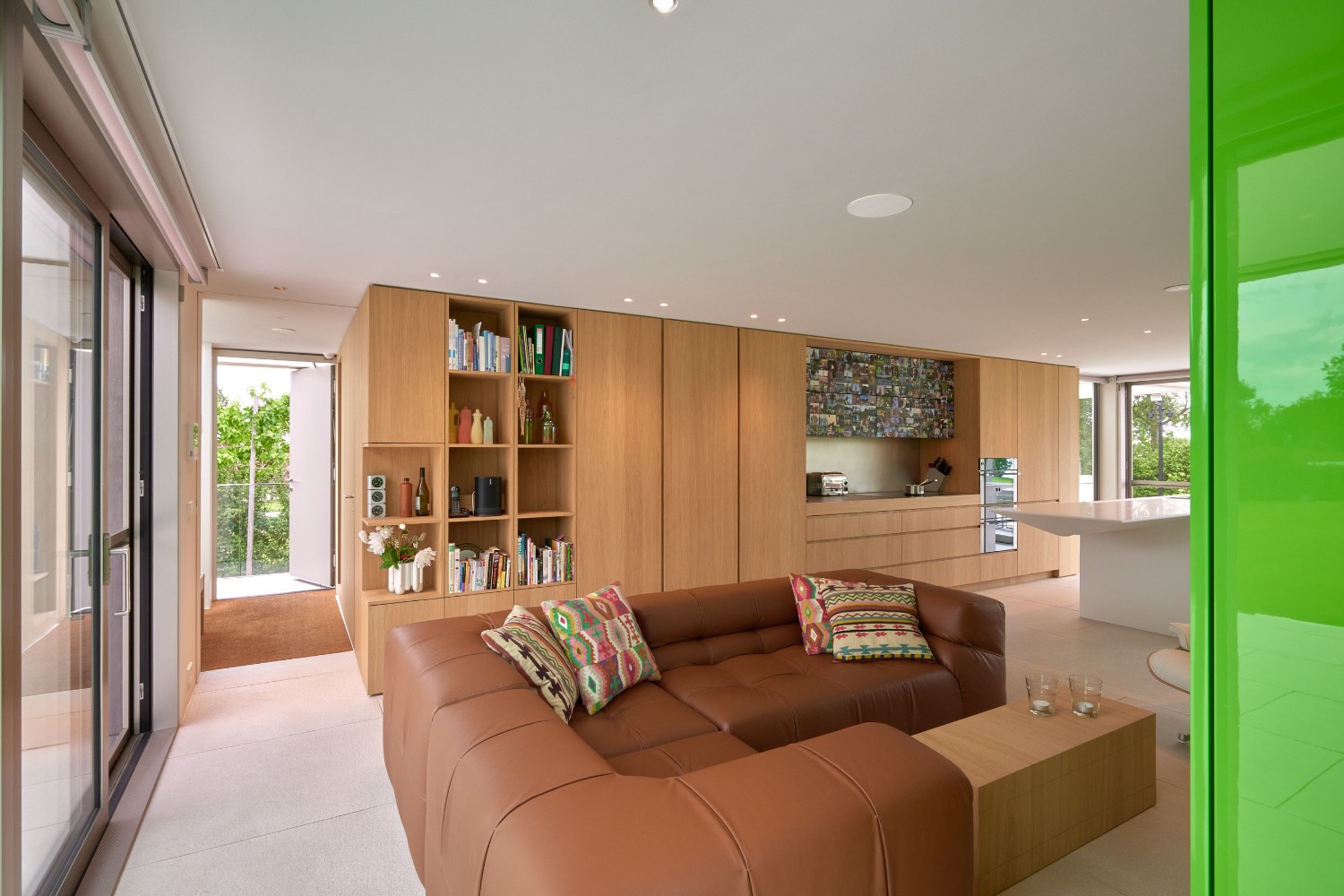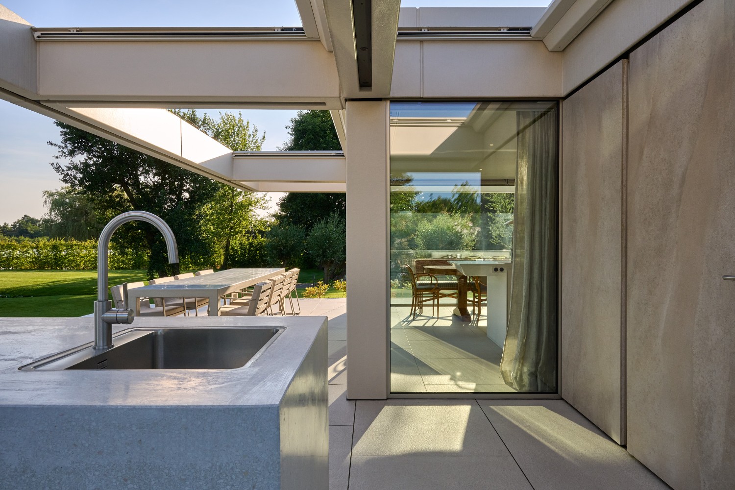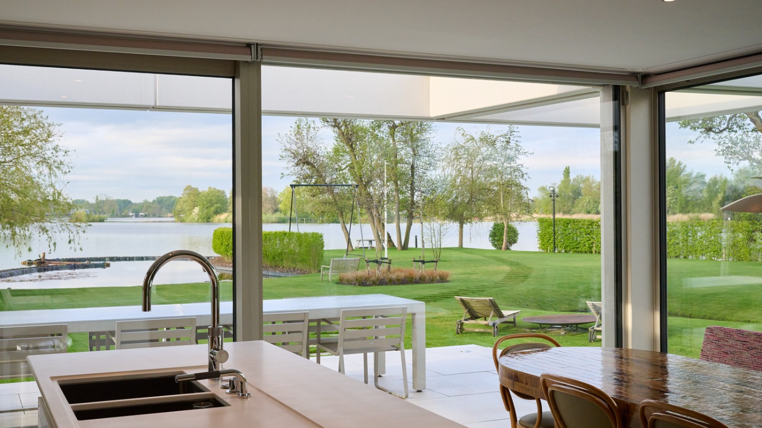 Om te profiteren van de schilderachtige ligging van de villa omlijsten grote ramen van vloer tot plafond de woonkamer, waardoor er een onbelemmerd uitzicht is op het water en de ruimte wordt overspoeld met natuurlijk licht. Het raamwerk van de luifel is zo ontworpen dat de zonwering een integraal onderdeel is en een zo rustig mogelijk beeld ontstaat.