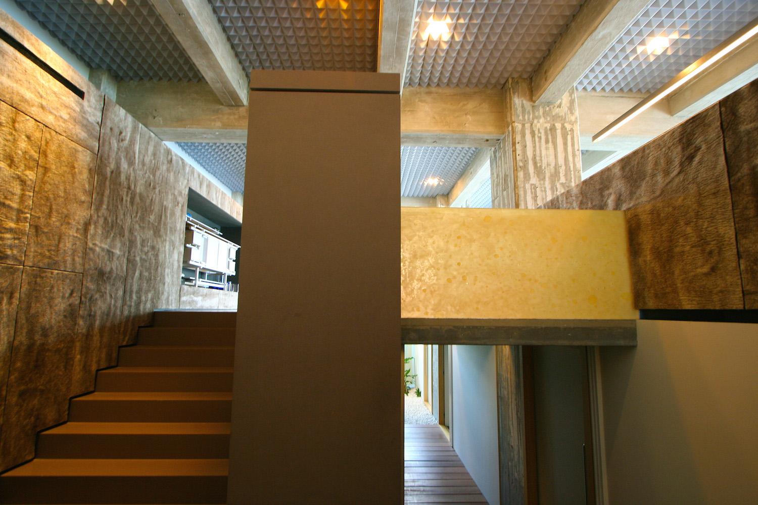 The pebble theme continues in the narrow hallway behind the bedrooms: through a glass sliding door facade in the bedrooms, you enter this very narrow space with pebble flooring, that gets its natural light and ventilation from the windows above. The ceiling of this narrow space is an open metal grid. This metal grid is used as flooring on the top floor where the living room and kitchen are located. Plants in pots are placed on this metal grid, so when you stand on the pebbles in the narrow hallway below, it is like you are standing beneath green trees and the air as well as the light is filtered in a natural way. That way, this narrow space can feel very comforting and not stifling at all.