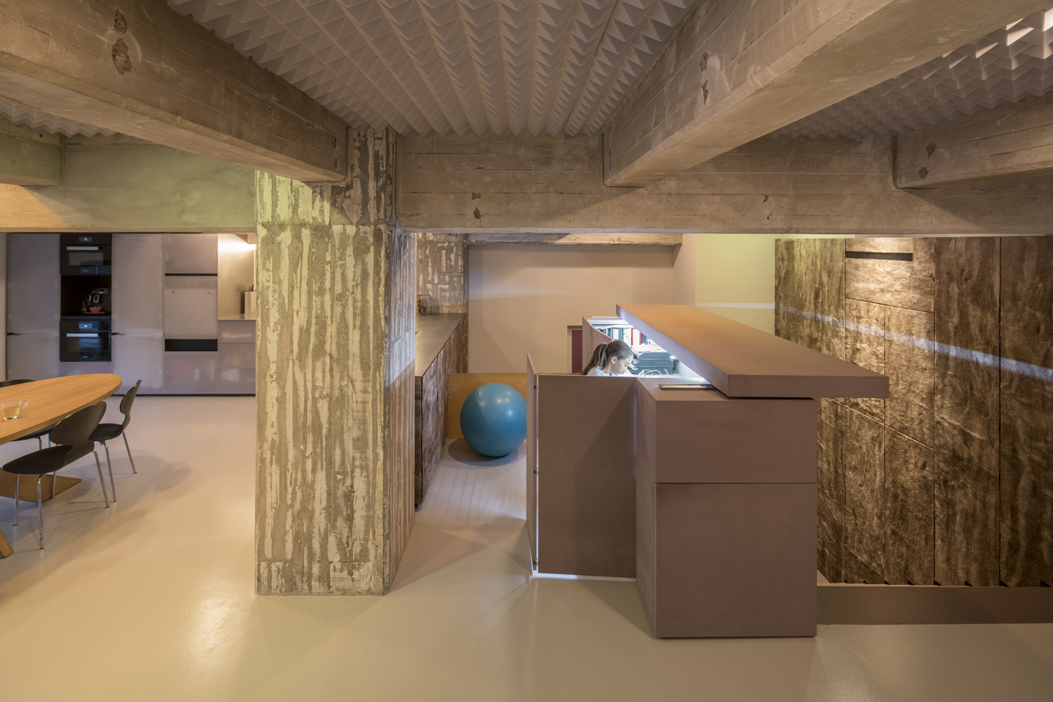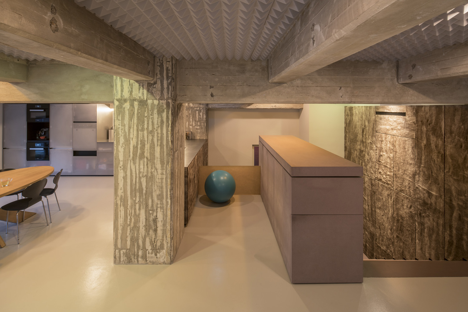By removing the heightened floor and the lowered ceiling it was possible to add another floor inside this apartment, creating extra living space and better ways to enjoy the river view. The original concrete beam structure of the ceiling that became visible adds to the industrial Rotterdam harbour atmosphere and shows the real history of the building. Also the columns were stripped of their stucco casing and the vertical patterns on the original concrete columns that the removal had left behind created an unexpected playful visual rhythm. To combine these hard and industrial materials with organic and warm materials, cupboards were coated with sheep felt. This soft and hairy felt has roughly the same colour and playful pattern of the smooth concrete columns - it evokes the senses and makes you want to touch it.