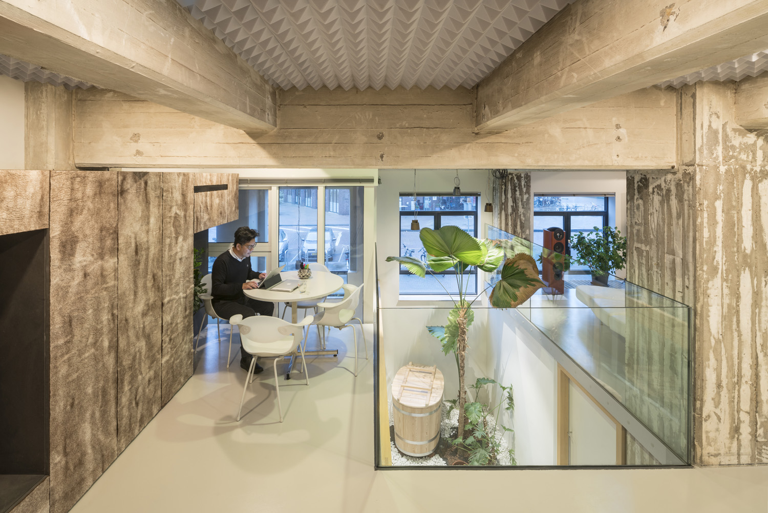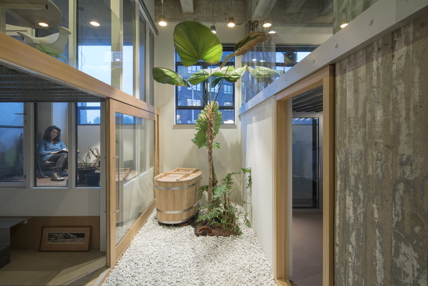 In this Rotterdam loft without any real outside garden space, an indoor tropical garden is created with a palm tree and an ofuro (a traditional Japanese bathtub) inside a double height space. When walking through this inner garden, you get a pebble beach feeling because of the white stones that cover the floor. The sensation is a tactile one: one of being on wild terrain, but the stones also make sounds when you are walking: giving you that outdoor feeling. You can walk barefoot like the ancestors from the east. You can lounge in a cool tub under palm tree leaves, while having a conversation with someone in the living room above. Through the void the inner garden extends itself from the floor to the ceiling - spanning 5,5 meters. By placing tall trees in the garden, you can also enjoy the green garden from the top floor.