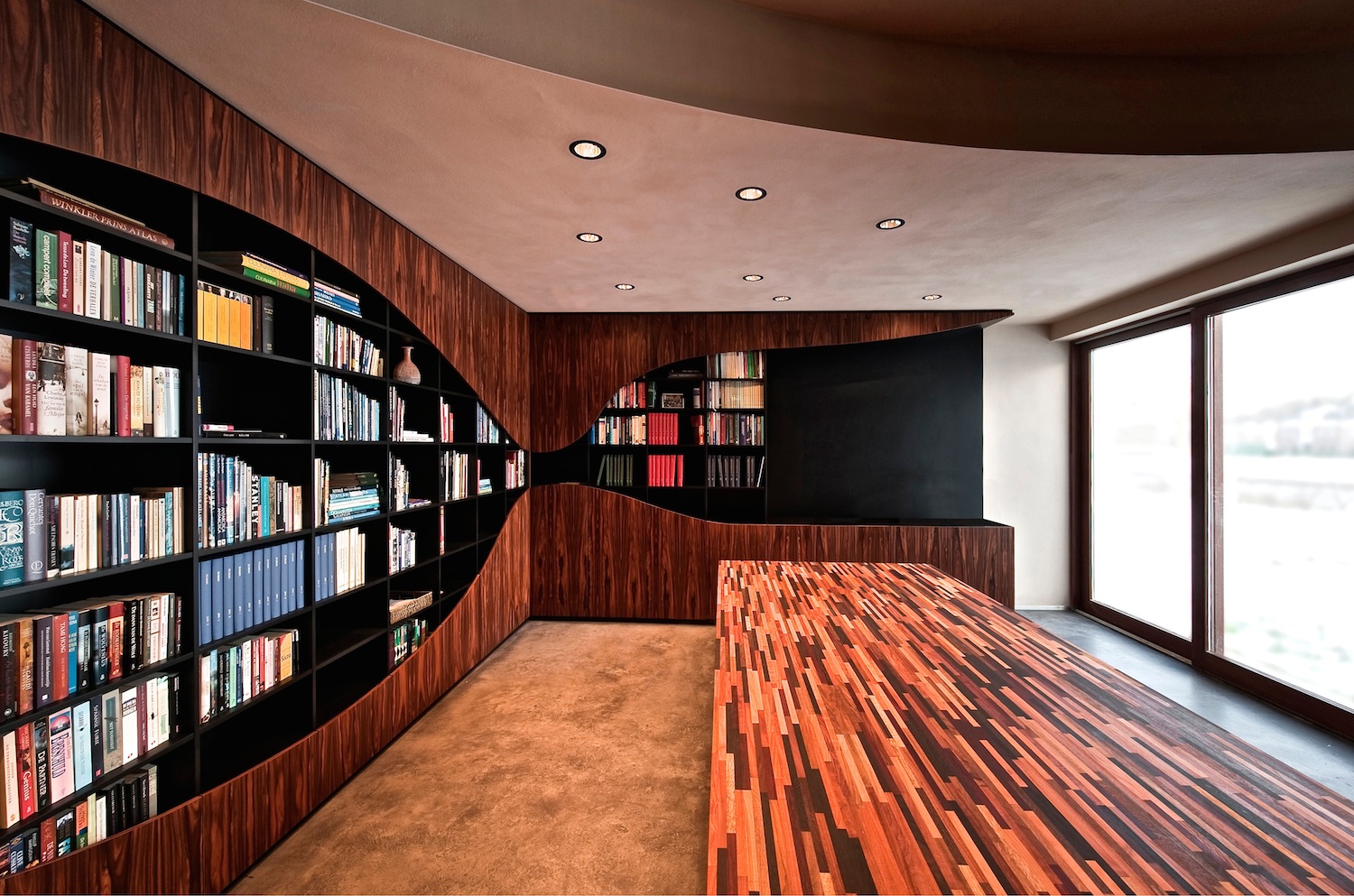 De doorzichten naar aangrenzende ruimten zorgen ervoor dat het gezin met elkaar in contact kan blijven. Je kunt de kinderen televisie zien kijken vanaf de werkruimte. De toepassing van organische vormen en duurzame materialen geven de villa een informele, ontspannen sfeer, ook al kan het huis een ideaal decor zijn voor elegante recepties.