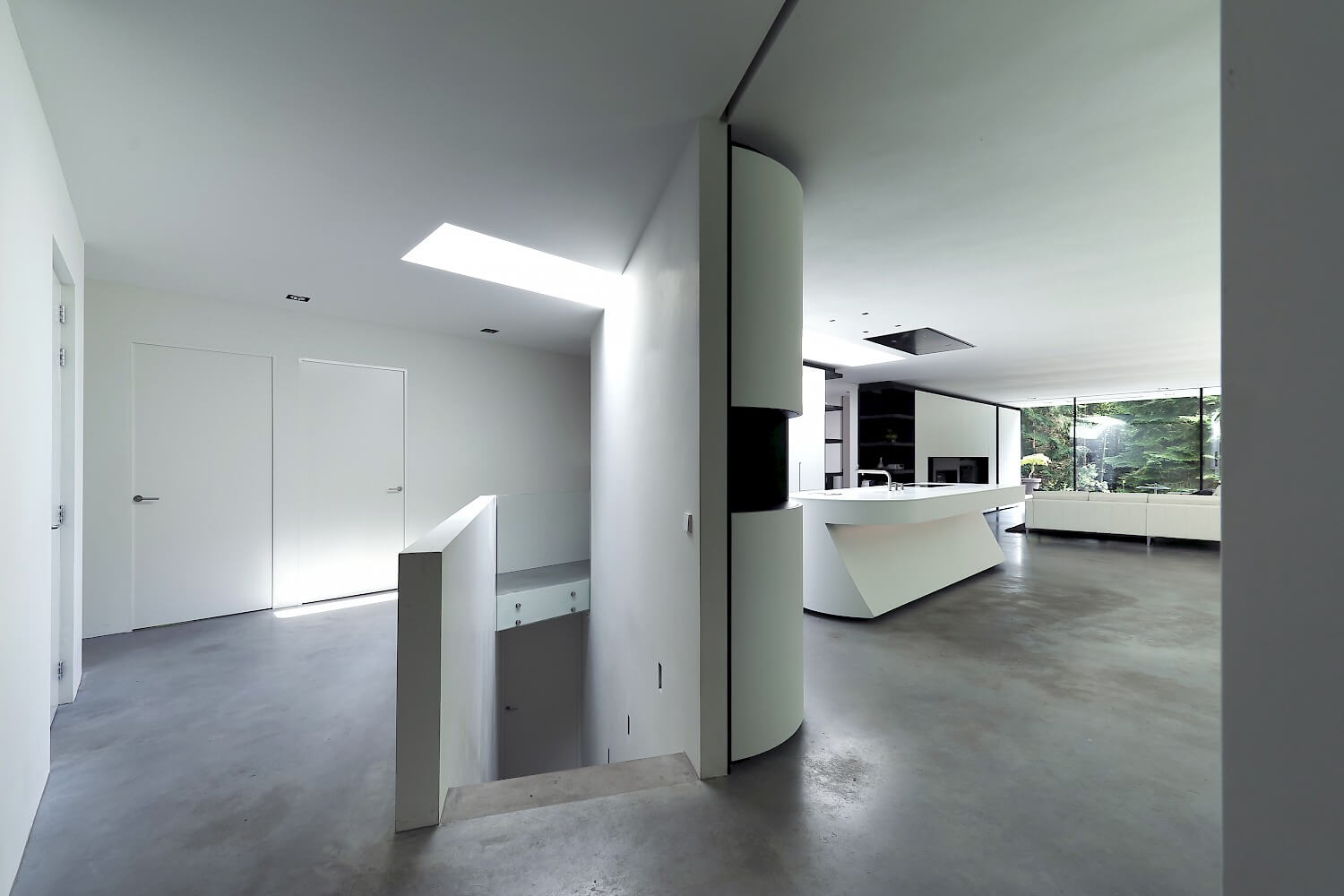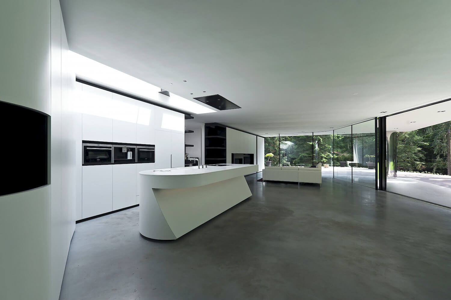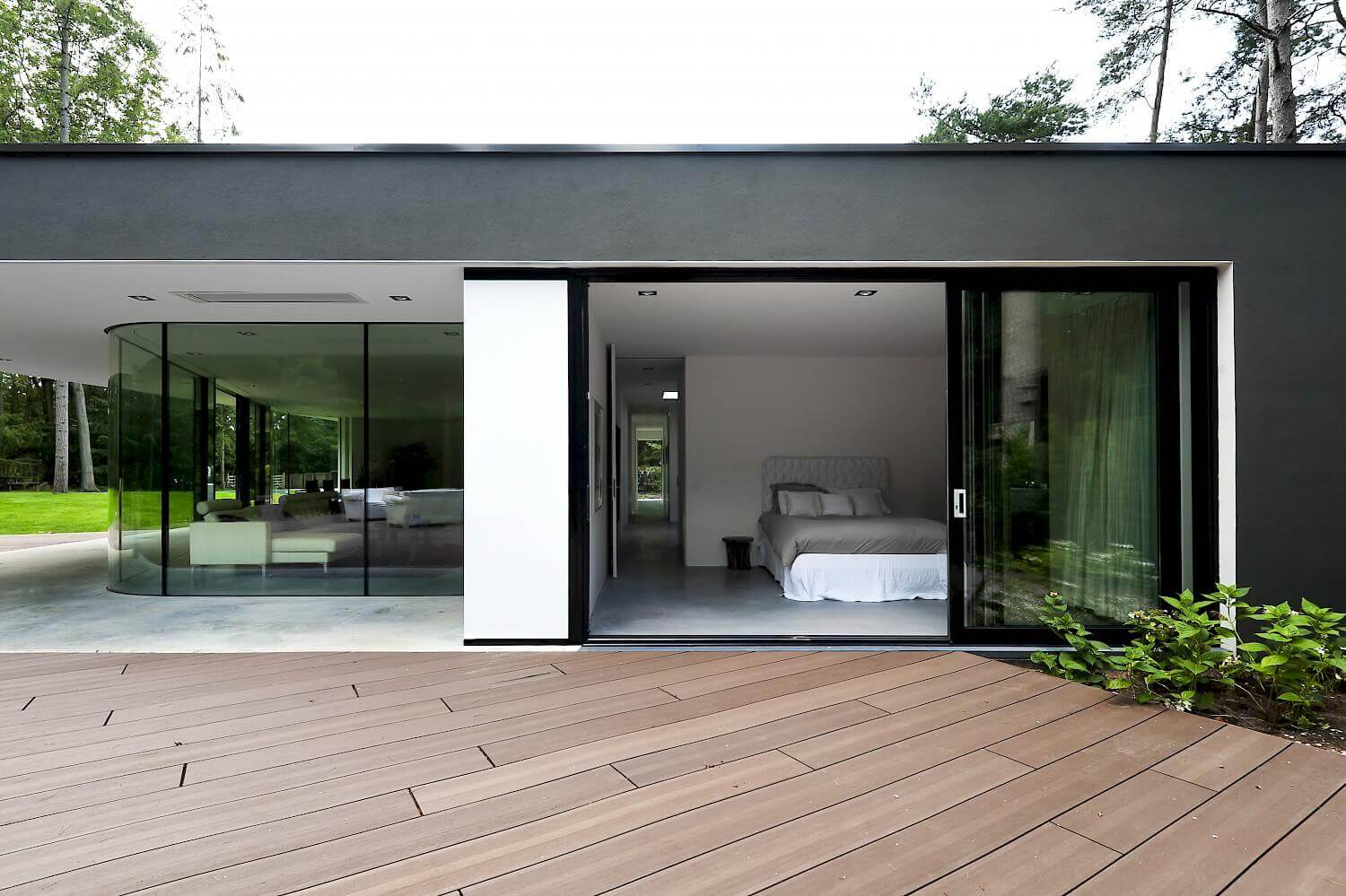 'Met mooi weer vind je ons niet binnenshuis. In onze huidige woning moeten we overdag helaas de lampen aan doen, zelfs in de zomer,' vertelde de opdrachtgever ons. Dit gegeven werd de drijvende kracht voor het ontwerp van deze moderne villa: het buitengevoel binnen in de woning brengen. 's Ochtends wakker worden en op blote voeten naar de woonkamer wandelen via het buiten terras. Een verwarmd terras voor extra lange avonden buiten. Een 16 meter lange glazen gevel waarbij de gordijnen overdag geheel onzichtbaar zijn voor maximale transparantie tussen binnen en buiten. Koken in de keuken onder een 5 meter breed daklicht, zodat je je binnen verbonden voelt met het weer buiten. Deze woonbeleving hebben wij in deze exclusieve villa vormgegeven voor dit gezin dat houdt van het buitenleven.