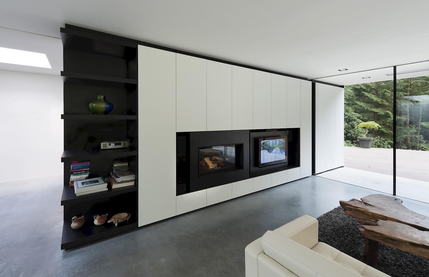 We hebben een 16 meter lange kastenwand ontworpen, die vanuit de woonkamer doorloopt naar buiten, voor alle behoeften aan opslag: een plek voor sleutels, post en tevens gsm oplaadplek op de plek waar je de woonkamer binnen komt, een voorraad ruimte in the keuken en een ingebouwde open haard, tv en audio systeem in de woonkamer. Het buitengedeelte van de kastenwand is een opslag voor tuinmeubilair en gereedschap. Het 16 meter lange gordijn wordt in open toestand gedeeltelijk opgeslagen in de kast. In het op maat ontworpen kookeiland is een afval container opgenomen, waar je vanaf het aanrecht eenvoudig bij kunt. De inloopkast en badkamer in de ouderslaapkamer zijn zo ontworpen en gepositioneerd dat zoveel mogelijk verstoring voorkomen wordt: de ene partner kan vroeg opstaan, douchen en aankleden met een minimum aan storend licht en geluid zodat de andere partner ongestoord door kan slapen.